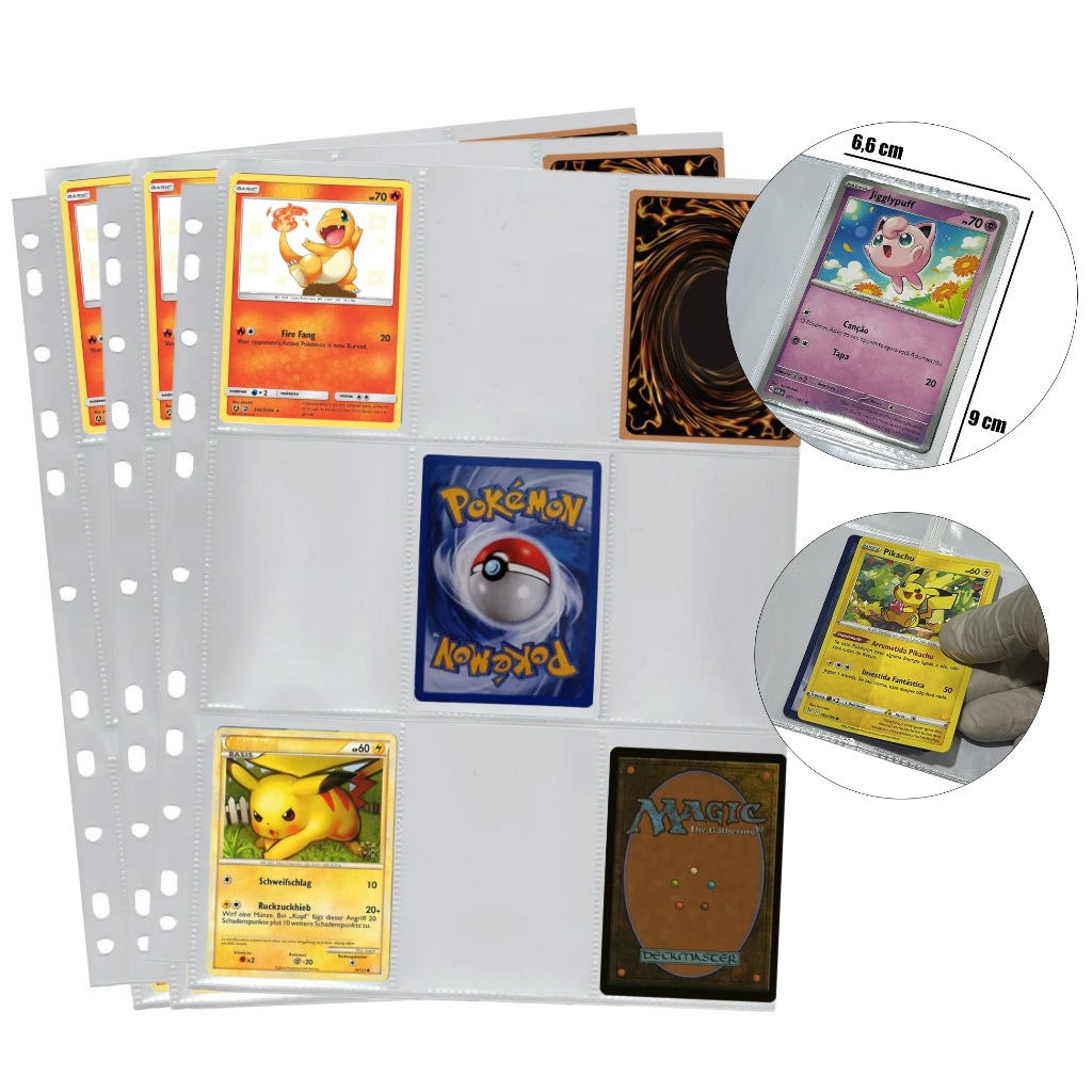 Kit com 10 à 50 Folhas para Cards e Cartas para fichário pasta Álbum argola 11 Furos 9 Bolsos Pokémon Magic Yugioh RPG Cardgame Figurinhas Coleção Colecionável Kpop Futebol copa do mundo bts black pink dragon ball naruto DIGIMON ONE PIECE