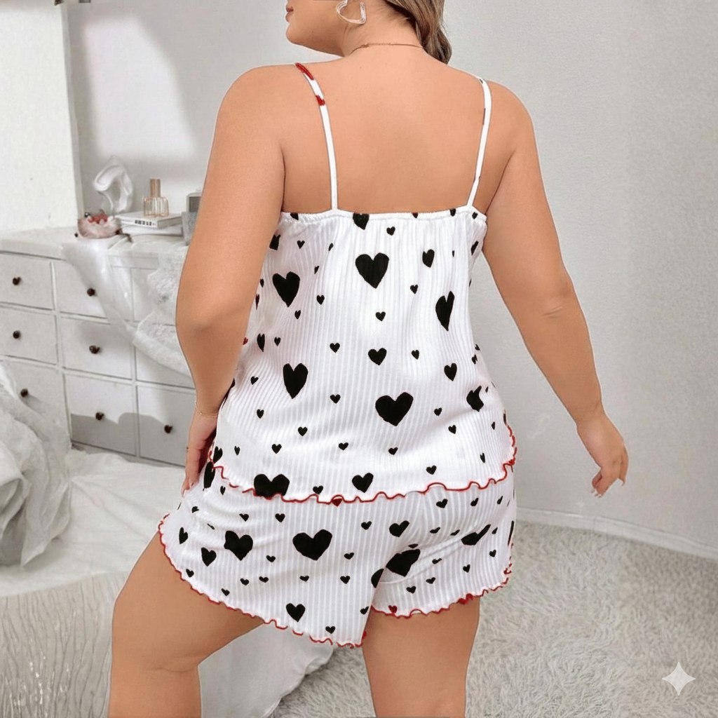 Kit com 2 Conjuntos Pijama Baby Doll Plus Size Canelado Estampa Coração G1 ao G3