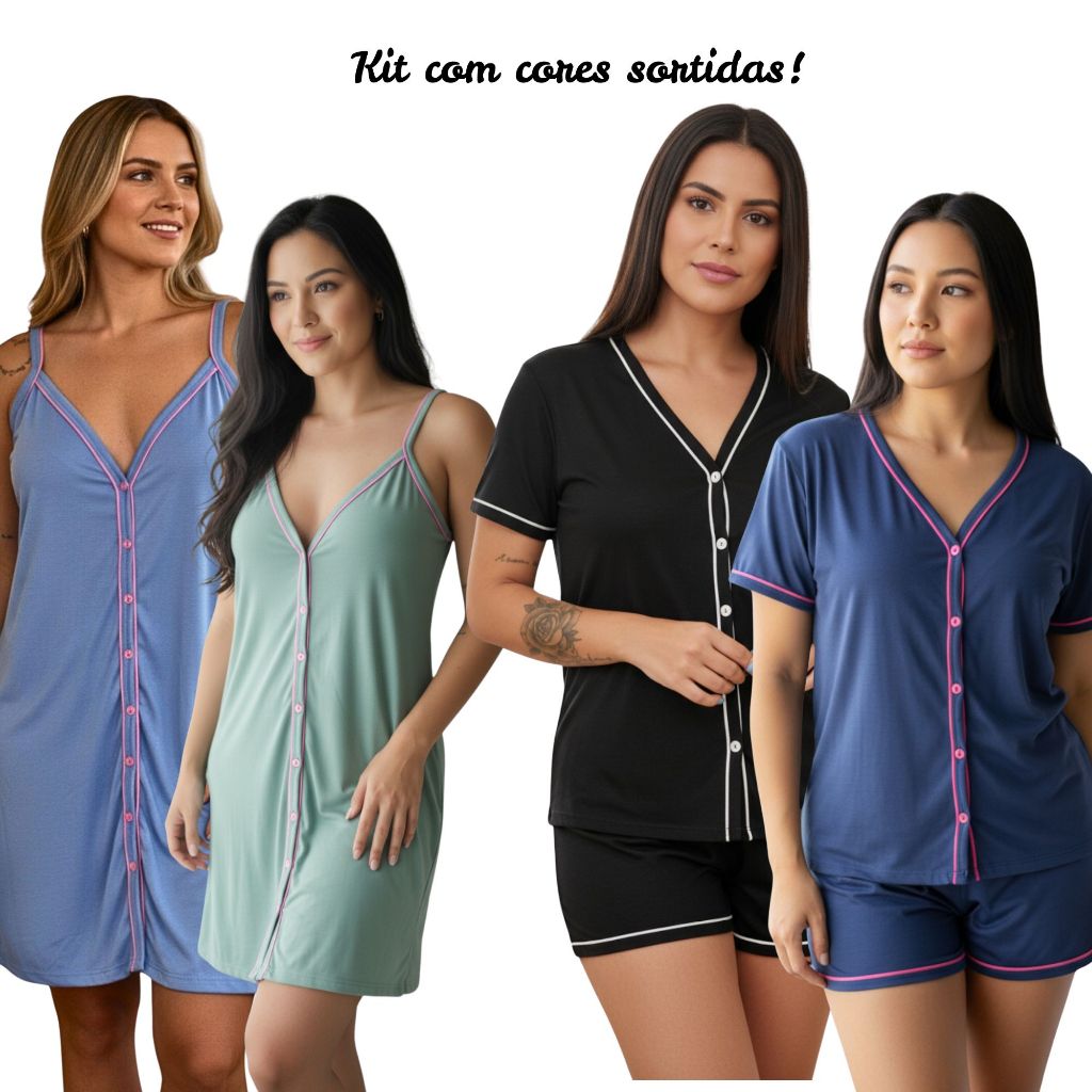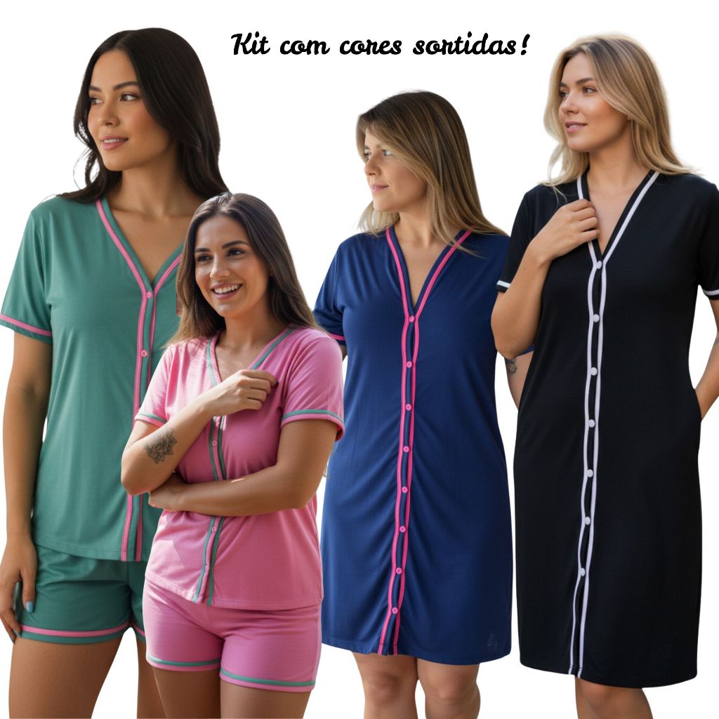 Kit com 2 Pijamas Baby Doll Amamentação Americano Cirúrgico com botões em Malha CORES SORTIDAS