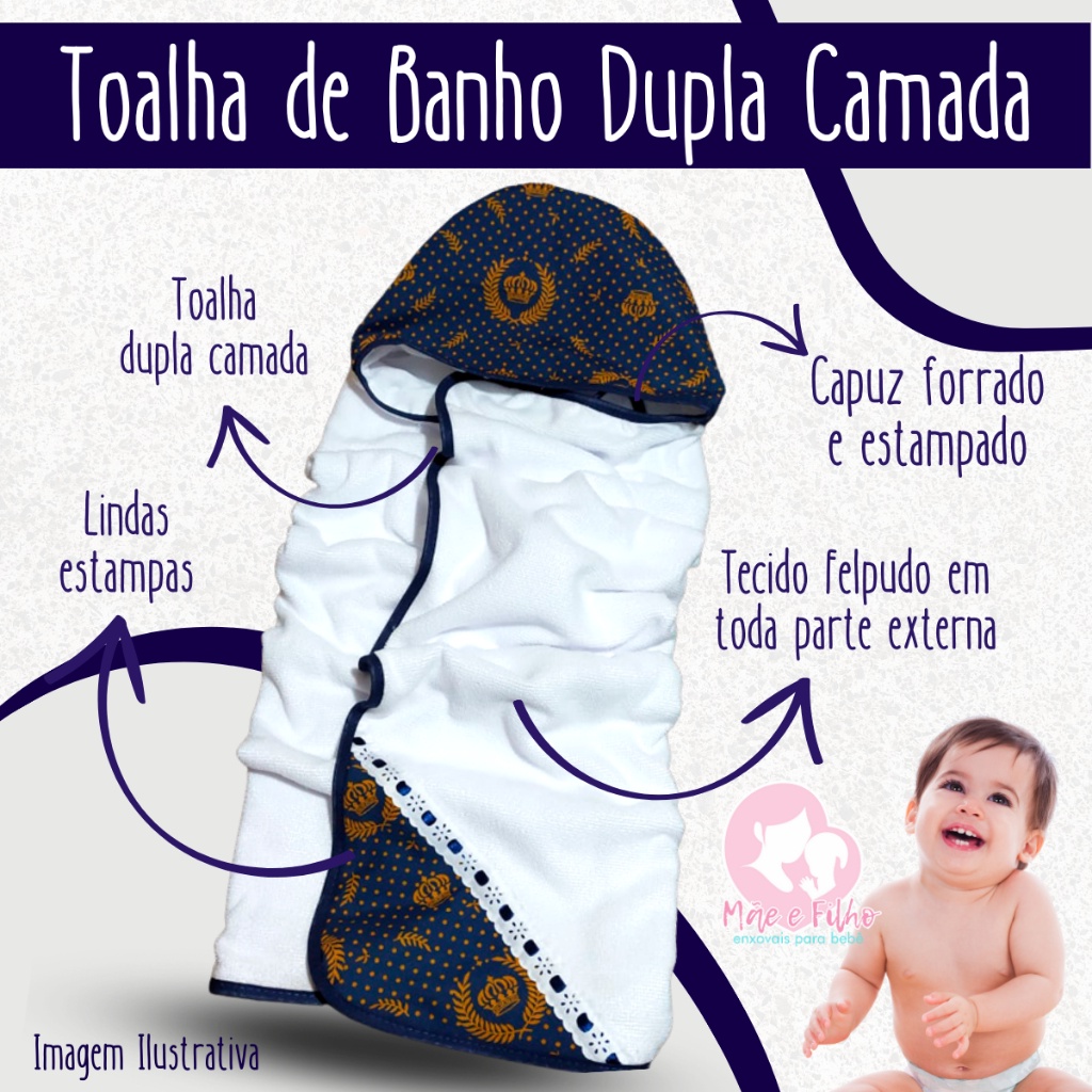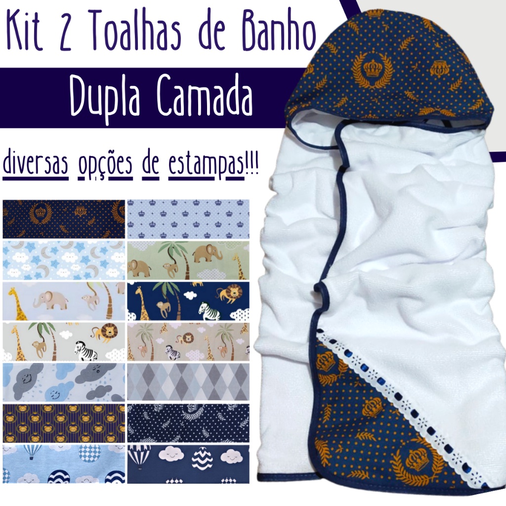Kit com 2 Toalha De Banho Bebe Dupla Face Modelo Luxo Com Capuz Forrada com Fralda 100% Algodão
