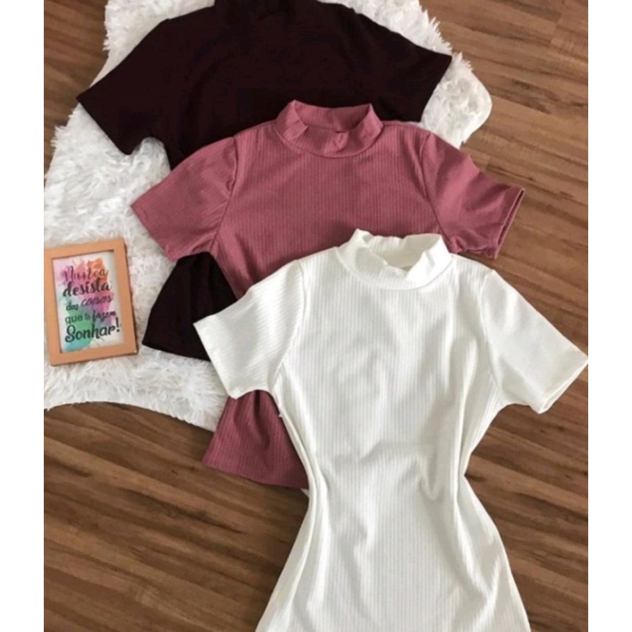 Kit com 3 Blusas Canelada Gola Alta com manga