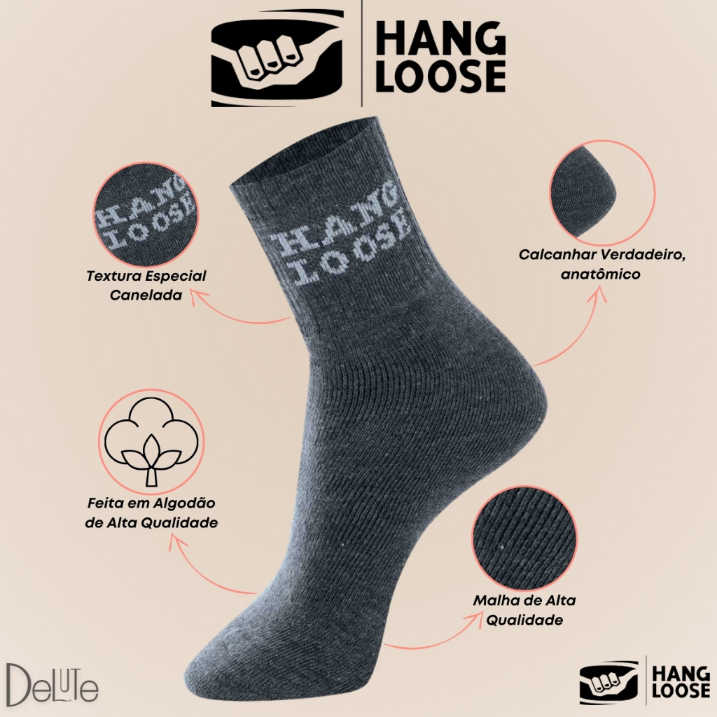 Kit com 3 Pares de Meias Hang Loose Modelo Cano Médio Lisa Básica Esportiva Calcanhar Verdadeiro