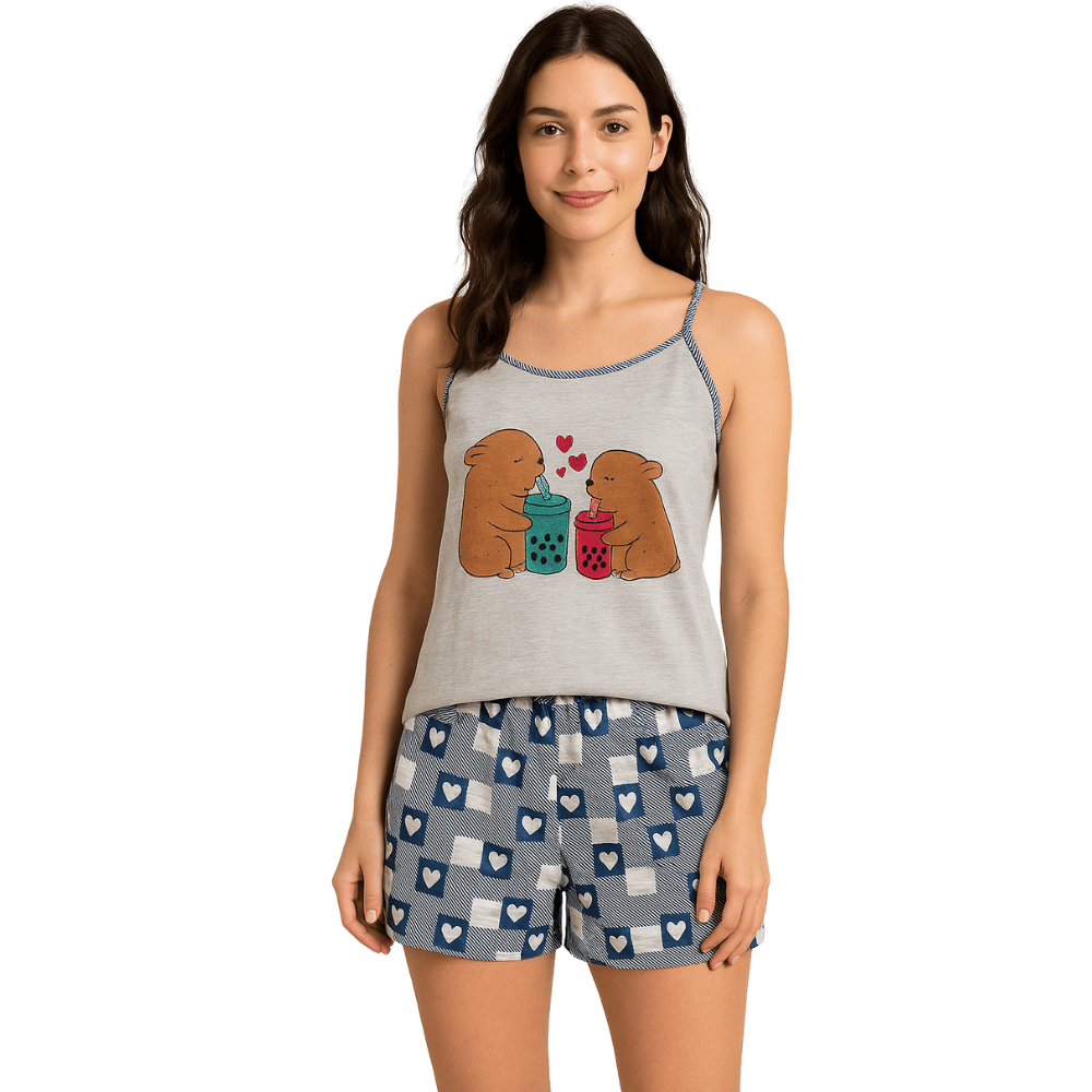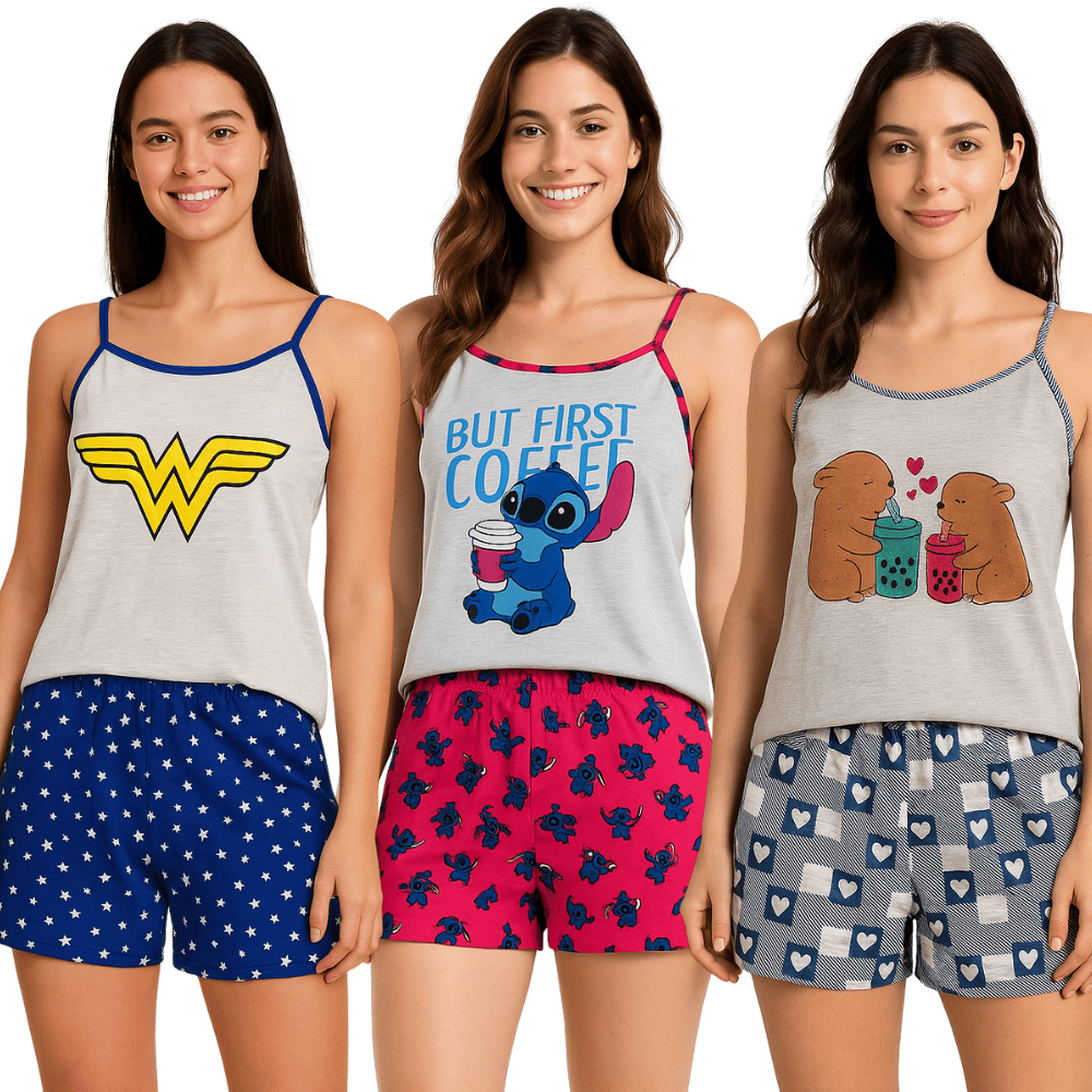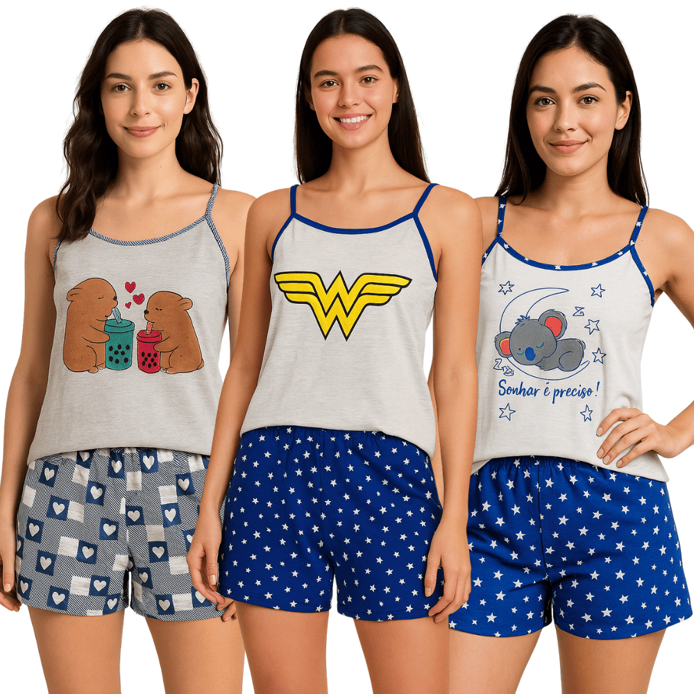 Kit com 3 Pijama Feminino de Alcinha Malha/ Kit 3 Baby Doll Feminino Estampado