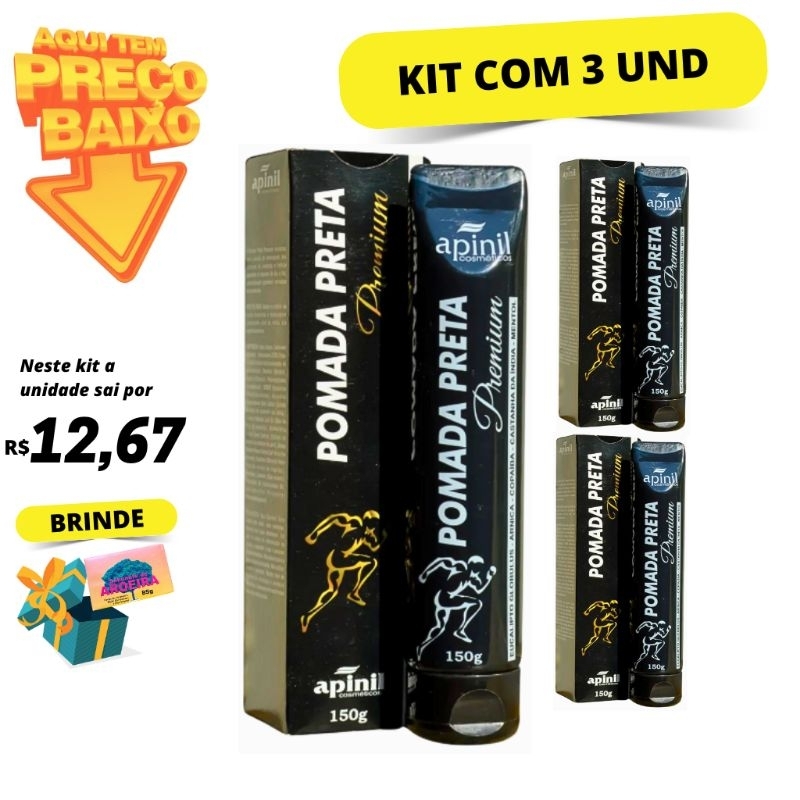 Kit com 3 Pomada Preta Premium 150g Apinil Pomada Massageadora