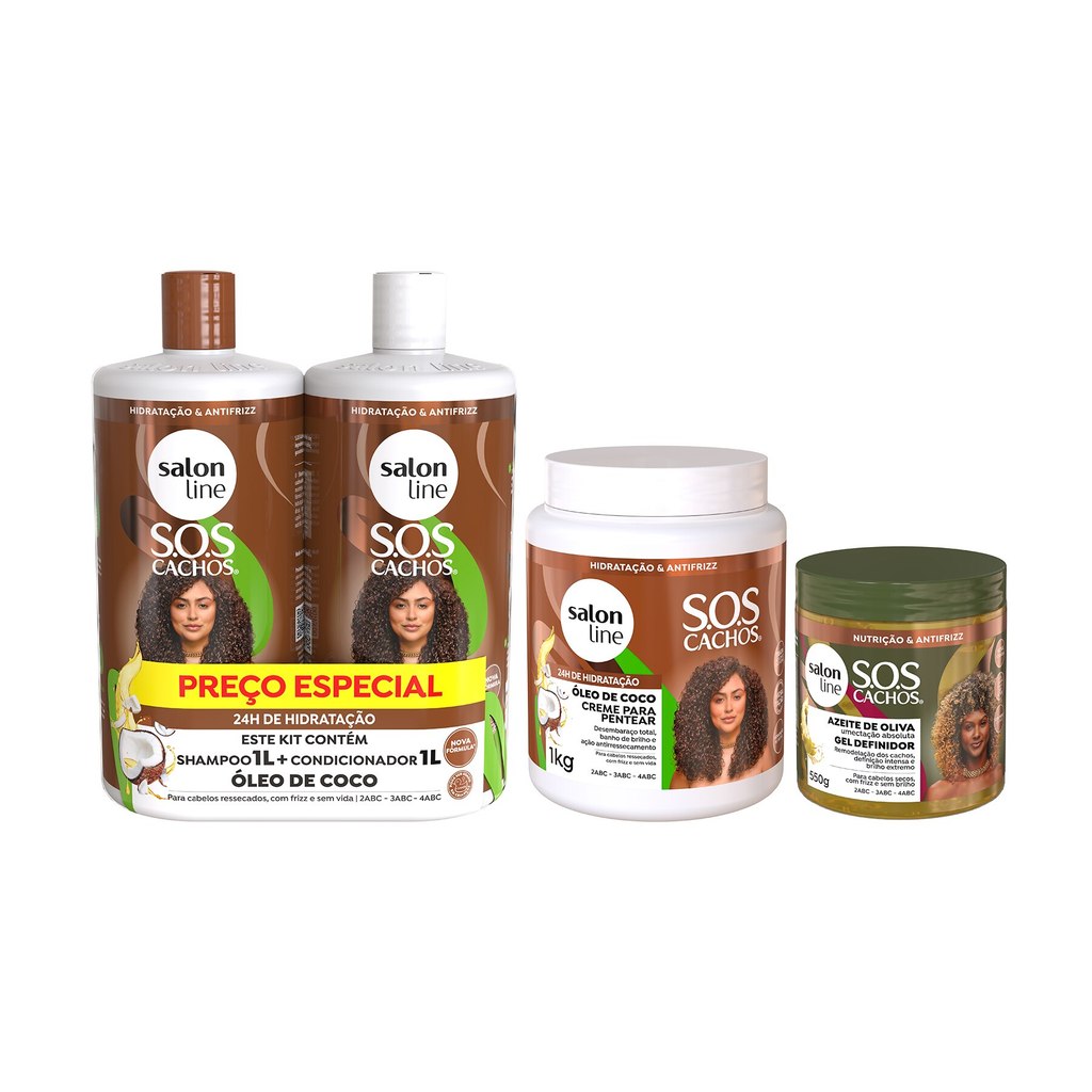 Kit com Creme Para Pentear + Shampoo e Condicionador 1L + Gel Definidor Sos Cachos Salon Line