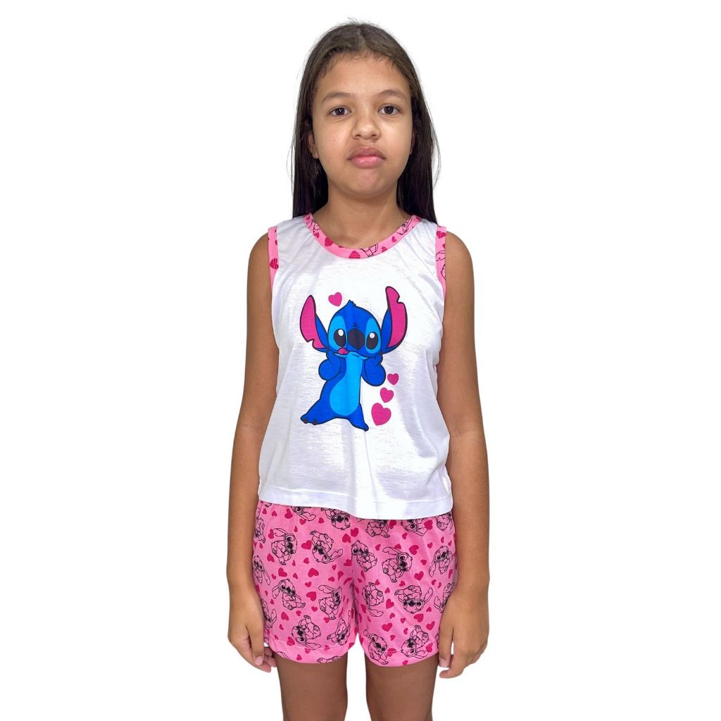 Kit pijama short doll infantil + pantufa feminino baby doll stitch malha verão atacado personagens