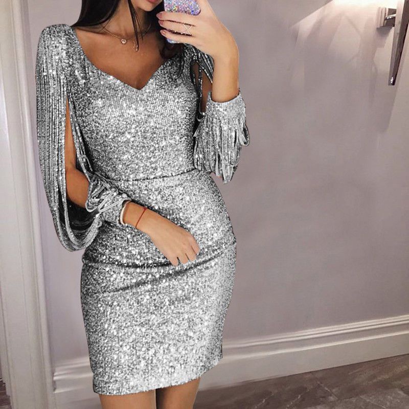 Lantejoulas Senhoras Elegante Sexy Mini Coquetel Casual De Pescoço Em V Vestido De Festa Slim