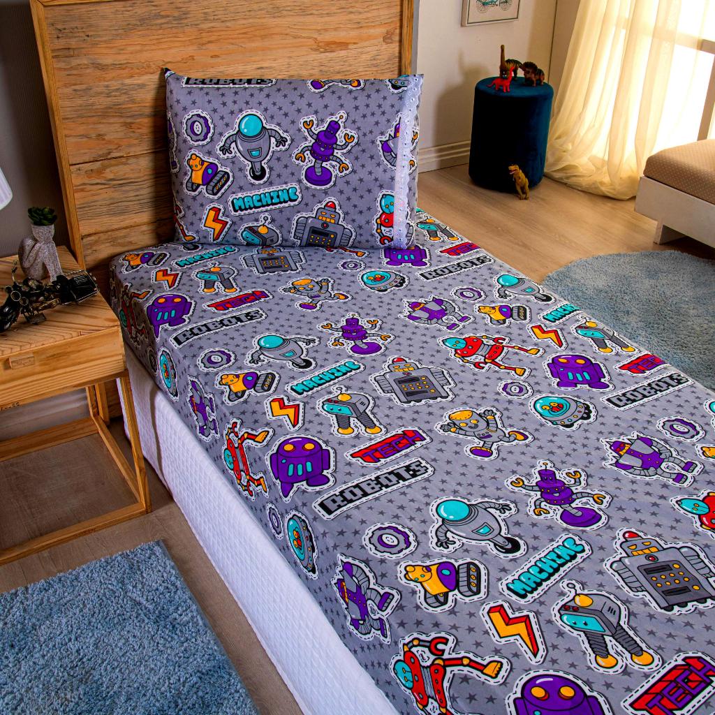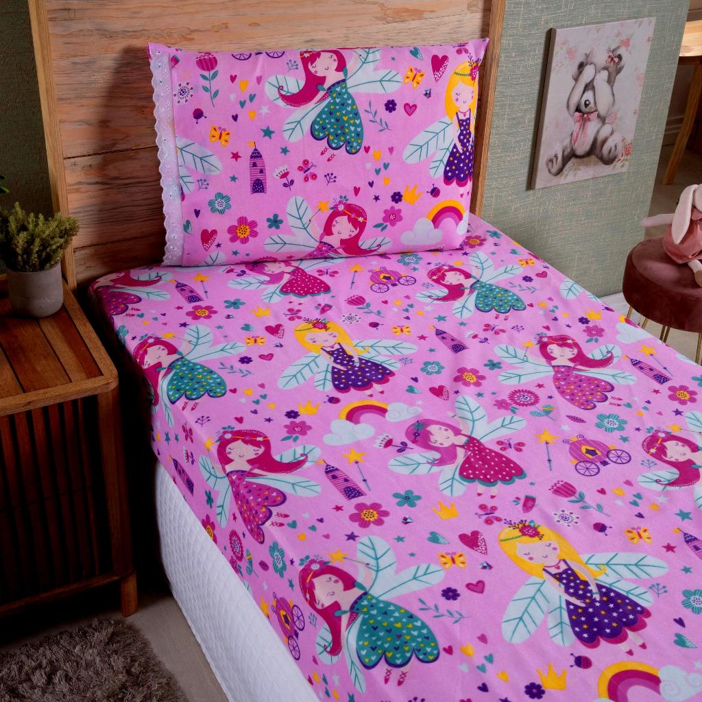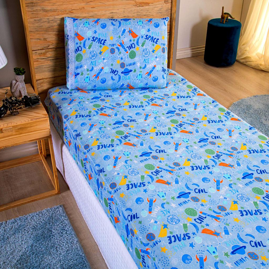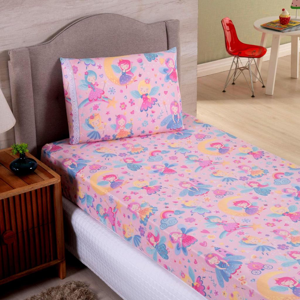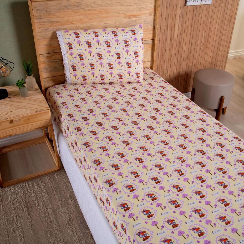 Lençol Solteiro 2 Peças Poliéster - Jogo de Cama Estampado Infantil Com Elástico Em toda Volta