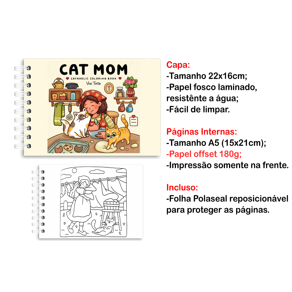 Livro de Colorir CAT MOM - 45 Folhas Papel 180g wire-o capa normal ou holográfica