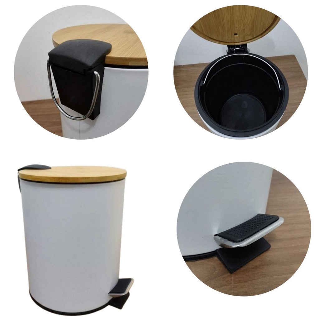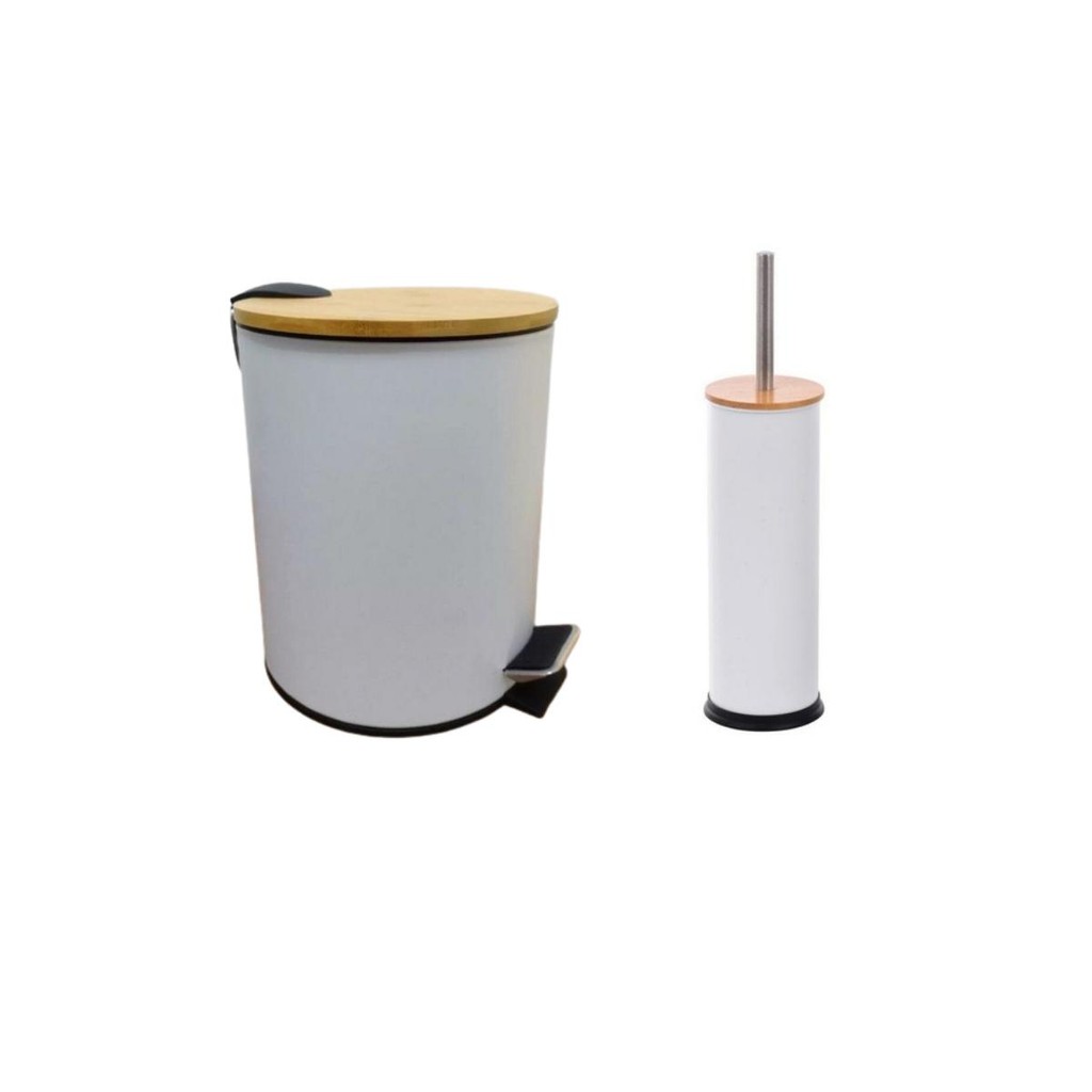 Lixeira Inox Branca Com Tampa de Bambu 3L + Escova Sanitária