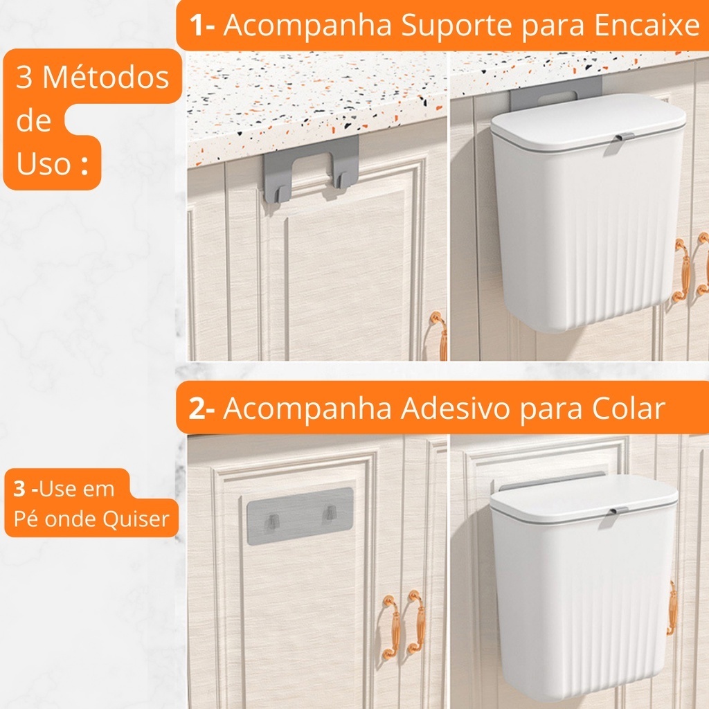 Lixeira Suspensa 9 Litros Com Tampa E Suporte Alto De Adesivos E Alça De Pentura Para Cozinha E Banheiro