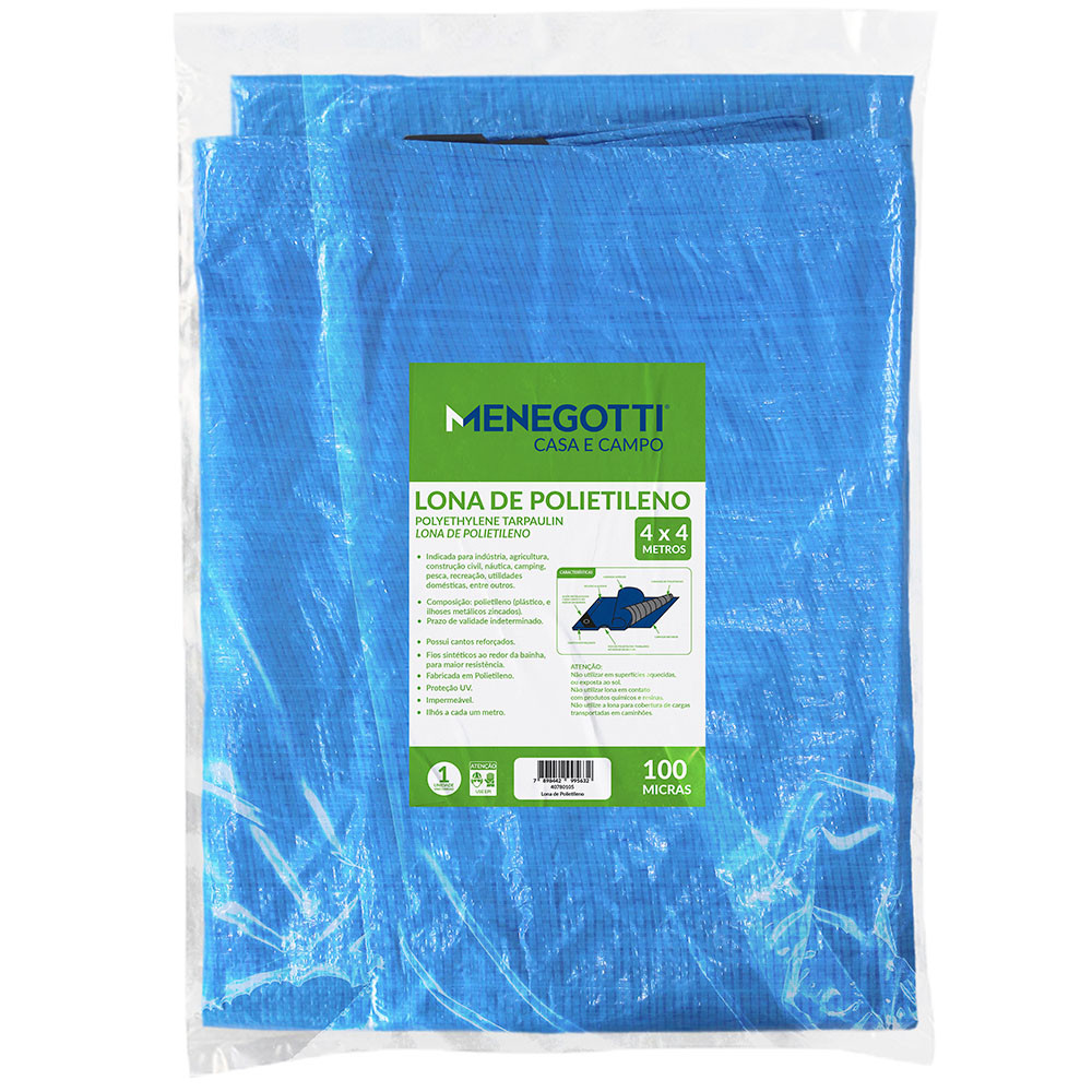 Lona Azul Menegotti de 4x4 Metros Feita em Polietileno e 100 Micras com Impermeabilidade Total