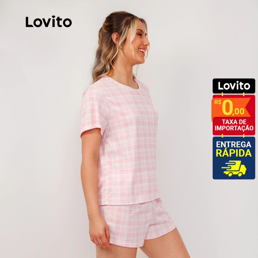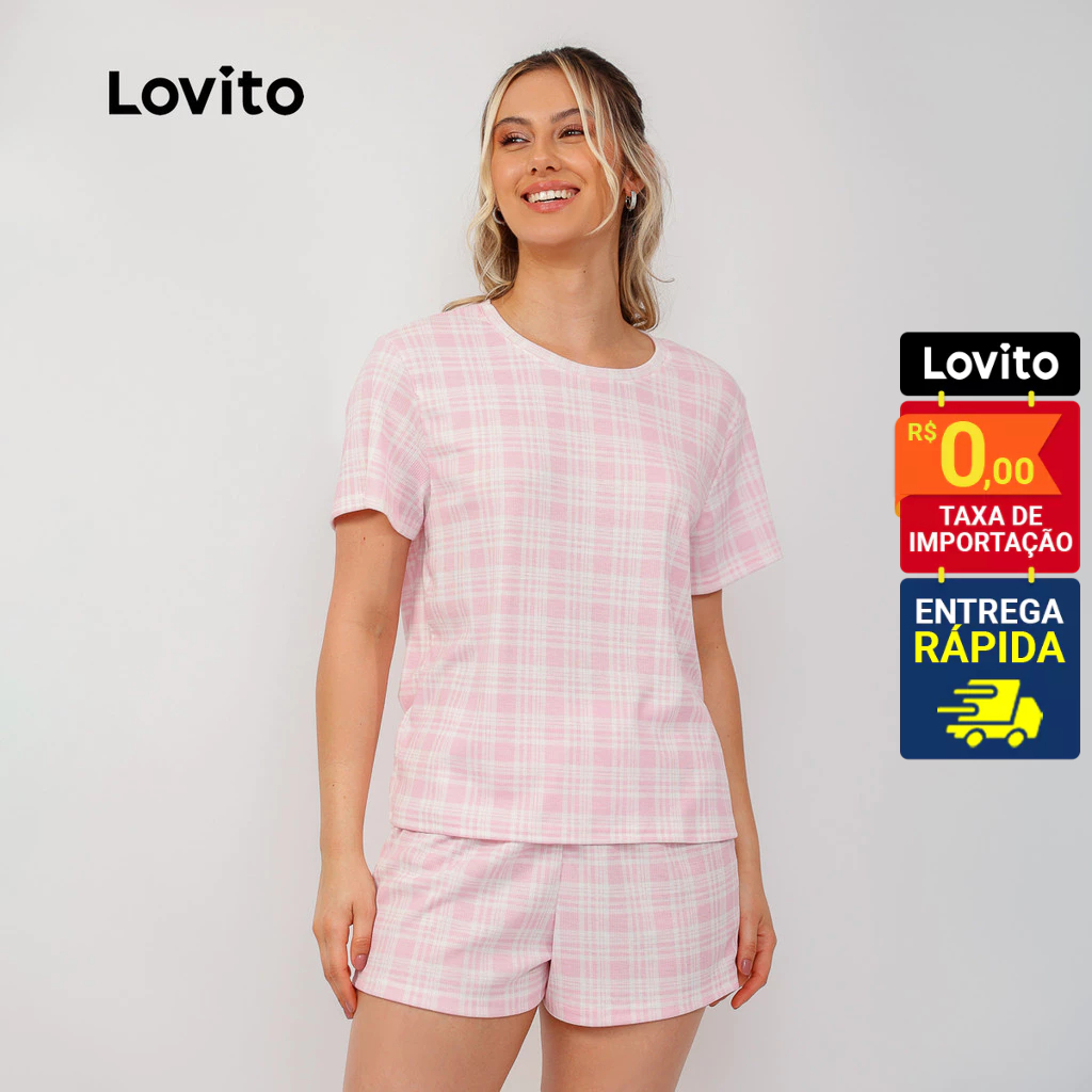 Lovito Conjunto Pijama Feminino Camiseta Manga Curta e Shorts Estampa Xadrez PJB1006BRL1036