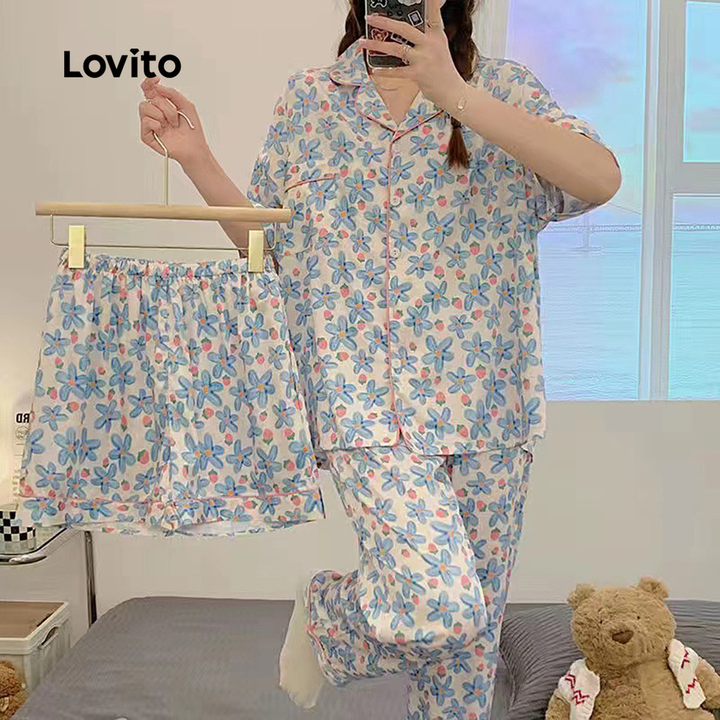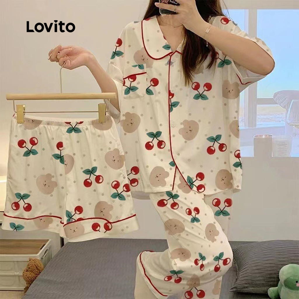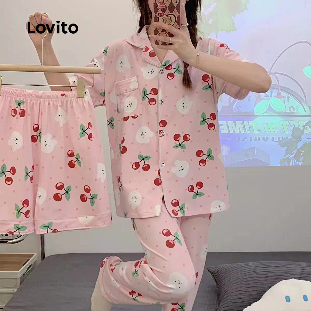 Lovito Conjunto de Pijama 3 em 1 3 Peças Camiseta + Calça + Shorts Algodão Nuvem Estampa Cereja para Mulheres LNE126191