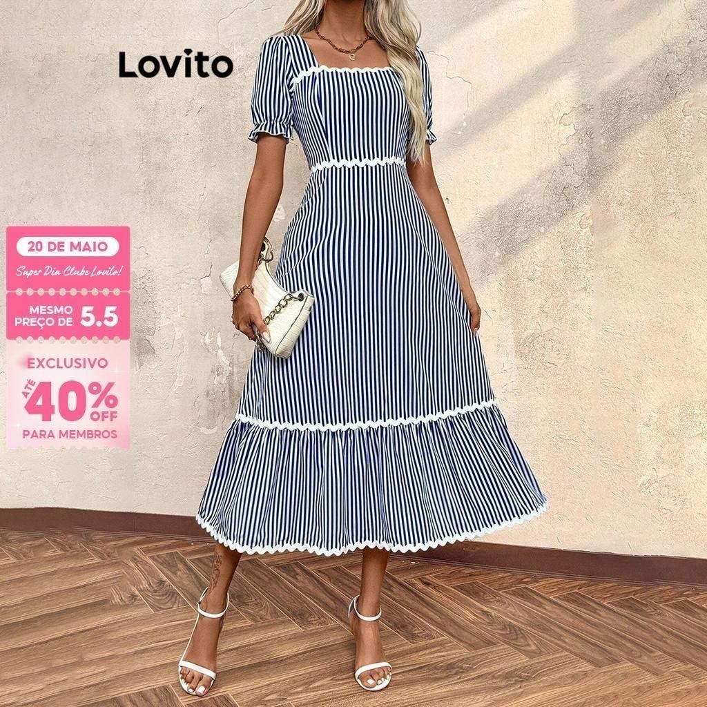 Lovito Vestido Boho Listrado Contraste Fita Estrutura Linha Vestido Mangas Puffs Para Mulheres LBL16576