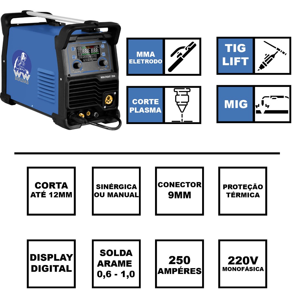 Máquina Inversora De Solda Mig Com ou Sem Gás, Tig, MMA E Corte Plasma Multicut 255 250A 220V