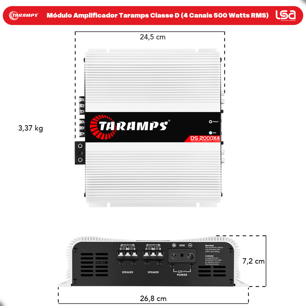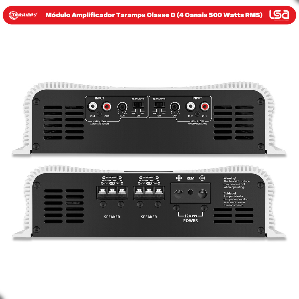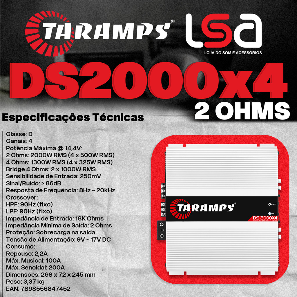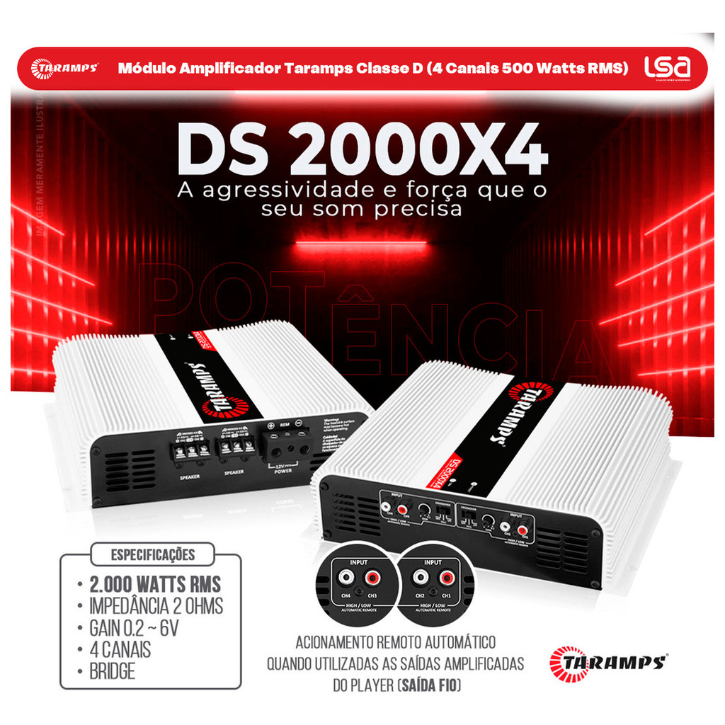 Módulo Amplificador Taramps DS2000x4 (4 Canais de 500WRMS) 2000 Watts RMS 2 Ohms Full Range Som Automotivo
