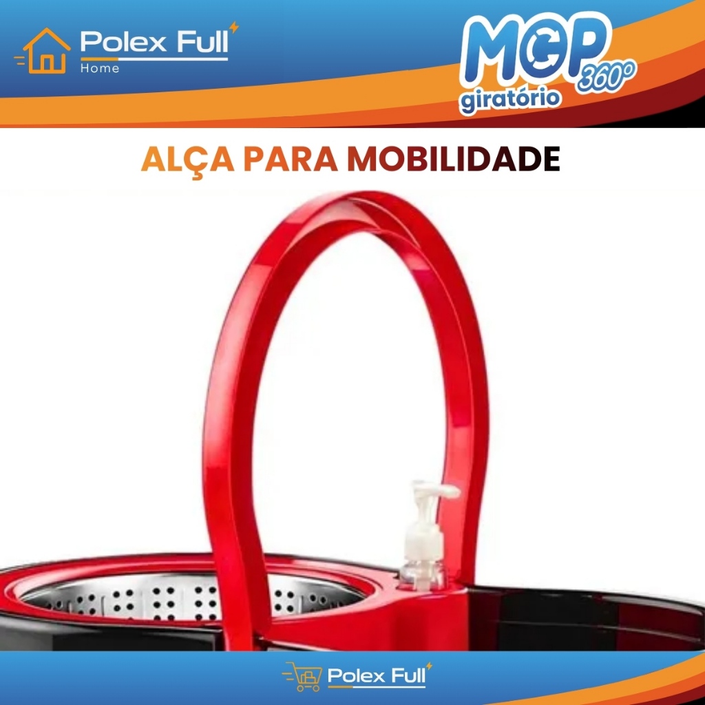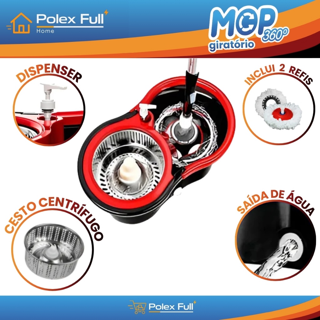 MOP 360 Giratório 14 Litros - Cabo 1.4m - Cesto Inox - Com Dispenser - 2 Refil - Polex Full Home