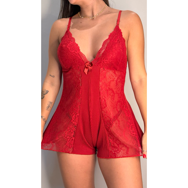 Macaquinho Baby Doll Feminino Canelado com Renda