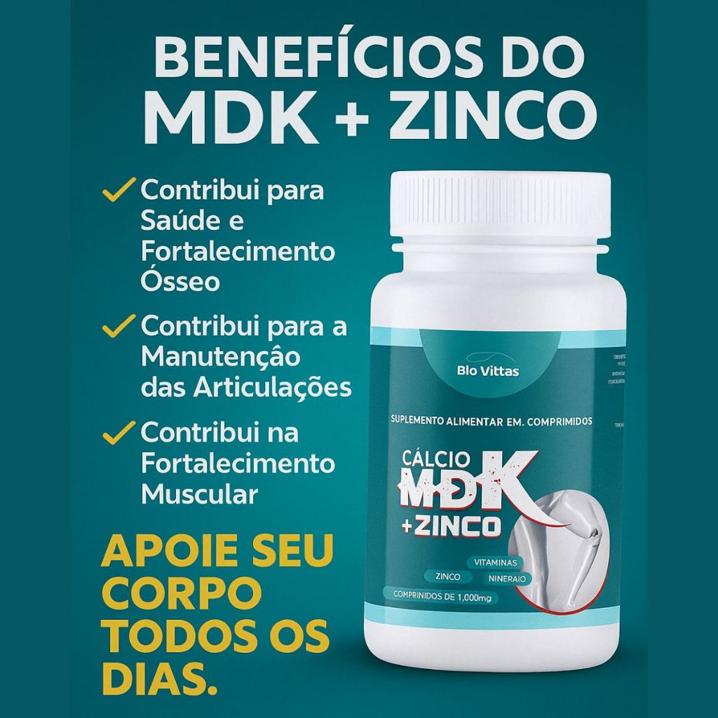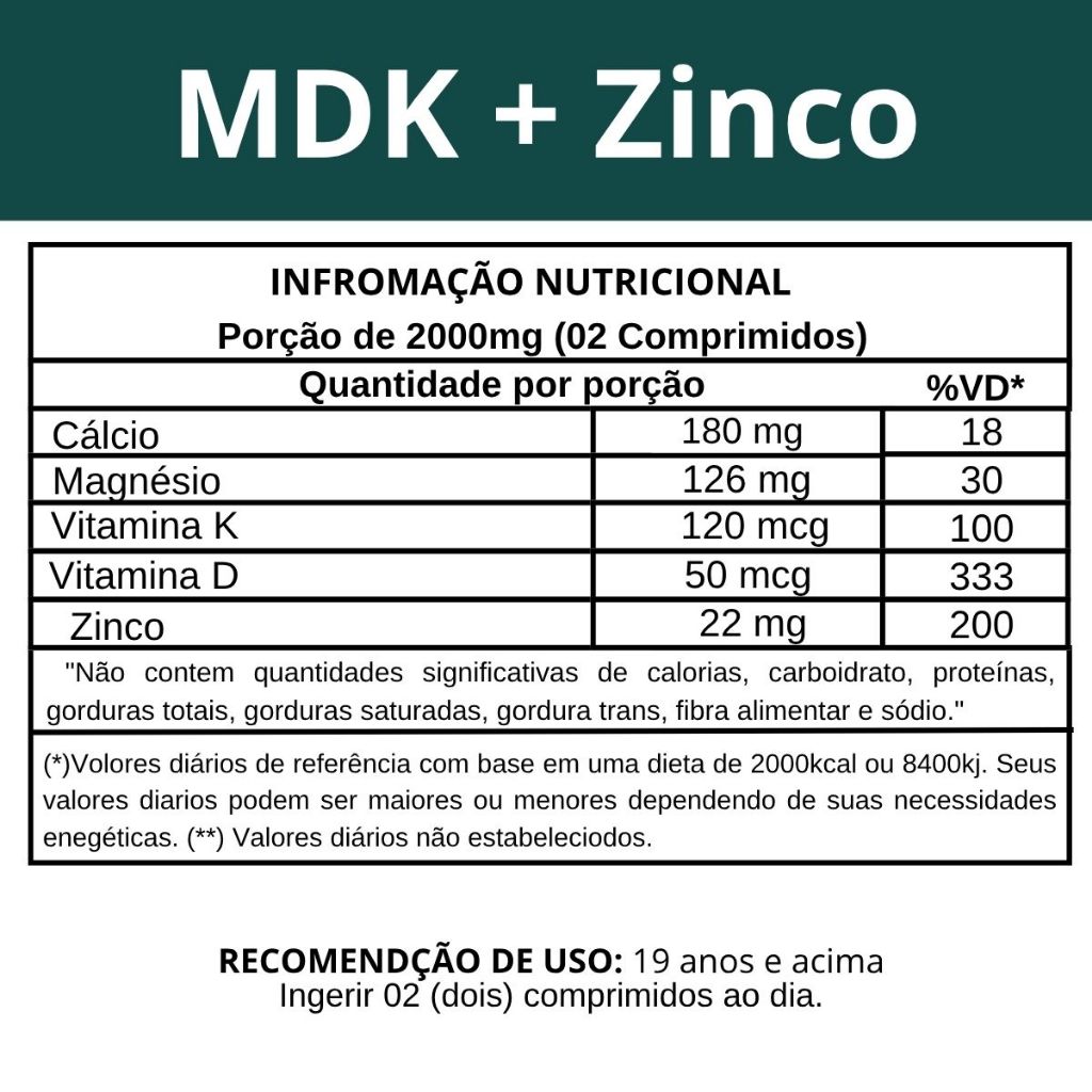 Magnésio + Cálcio Vitamina e Zinco Vitamina D3 2.000 UI e K2 - MDK + ZINCO Comp - Bio Vittas
