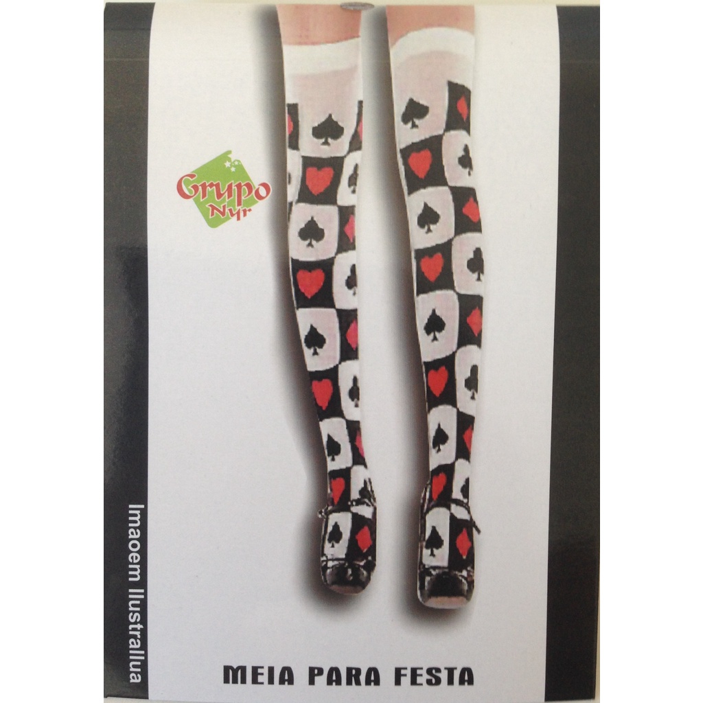 Meia Fina Tamanho 7/8 Adulto Branca com Naipes de Baralho para Fantasia Arlequina Carnaval e Cosplay