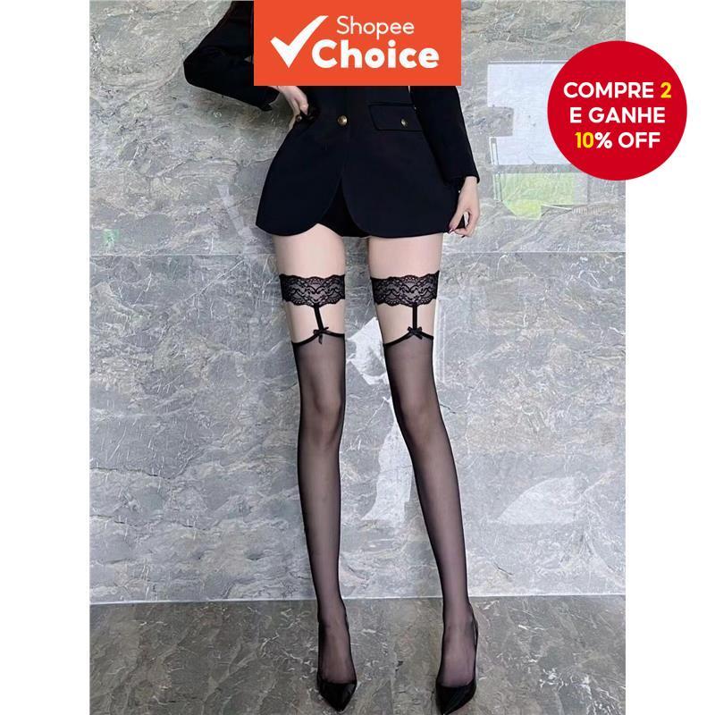 Meias De Liga De Renda Sexy Pretas Até A Coxa Com Floral E Laço (Para Cosplay/JK)