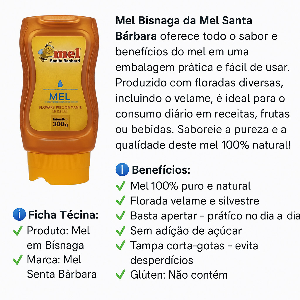 Mel Puro Santa Bárbara 300g Bisnaga | FLORADA VELAME | Tampa Corta-Gotas | Direto da Abelha