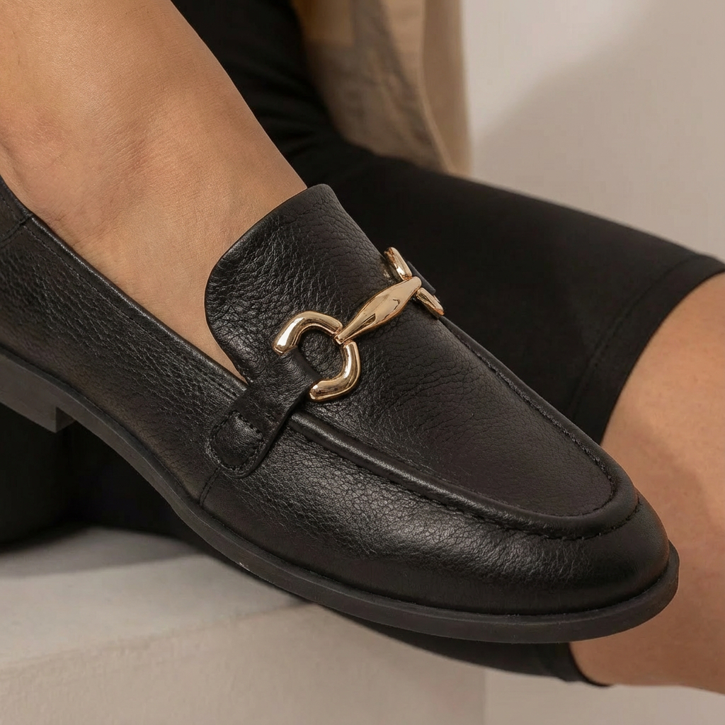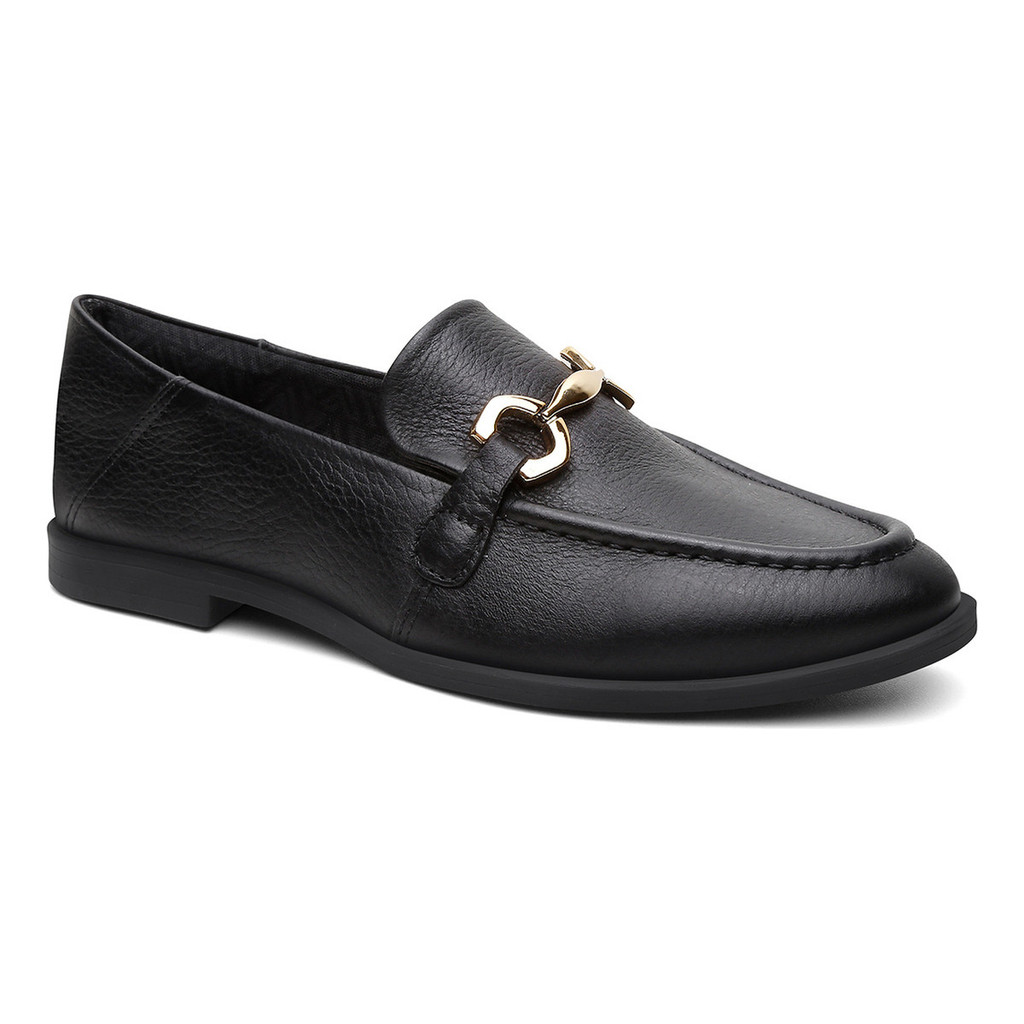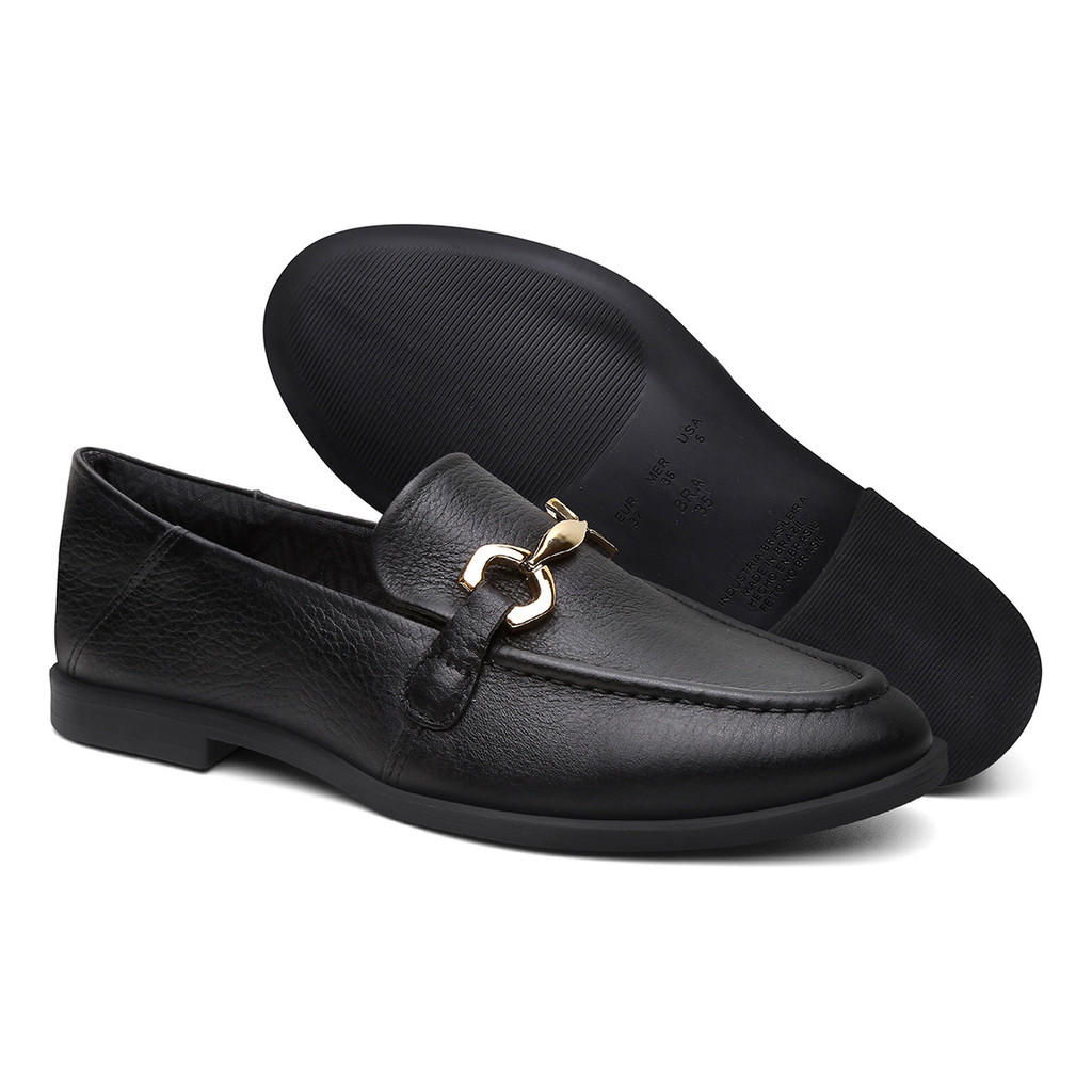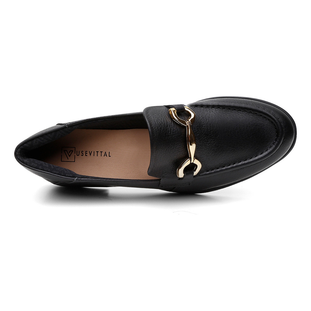 Mocassim Mara Preto Feminino Vittal Couro Legítimo Metal Dourado Leve Macio Elegante