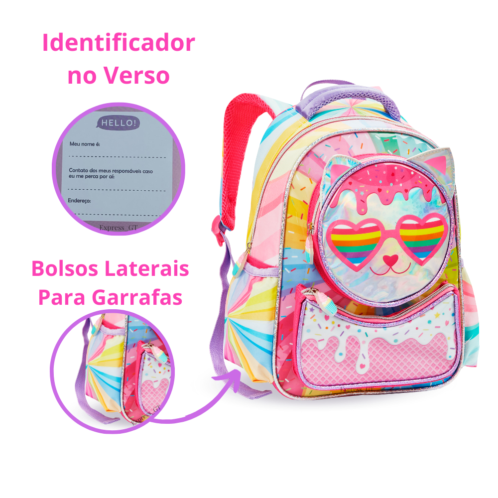 Mochila Feminina Infantil Escolar Menina Gatinha Holográfica Reforçada Pequena e Grande