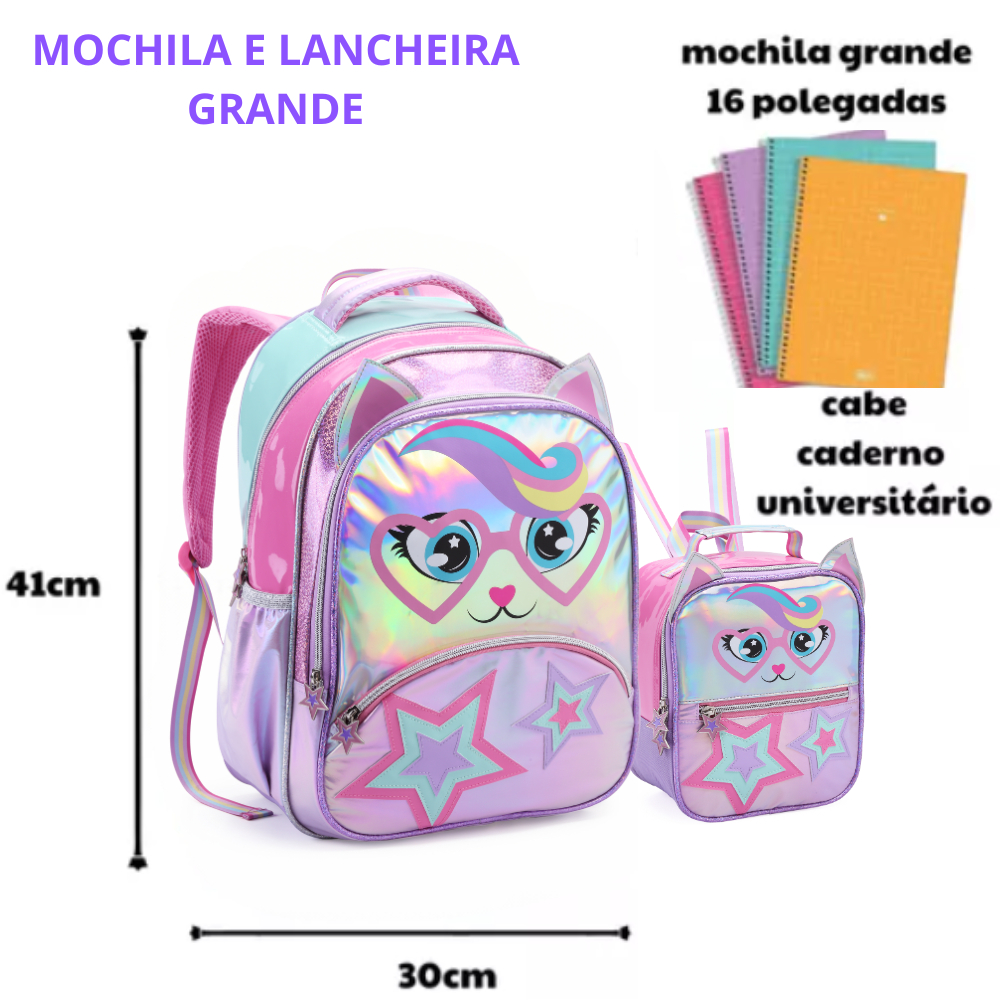 Mochila Infantil Menina Escolar Feminina Gatinha Holográfica Costas Lancheira Térmica e Estojo G, P