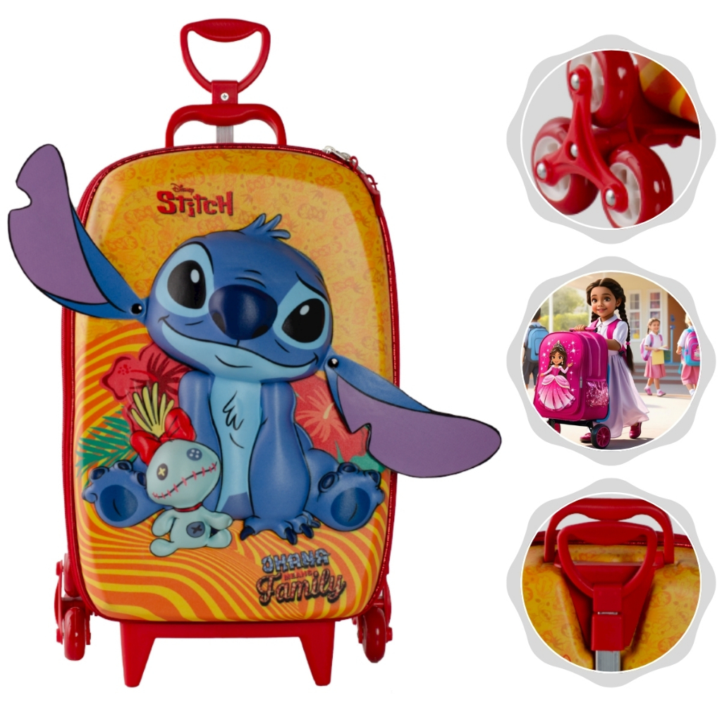 Mochila Mala de Rodinhas Infantil Escolar 3D Vingadores Marvel Disney Stitch Max Toy