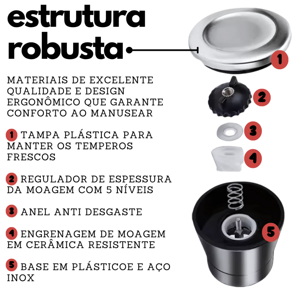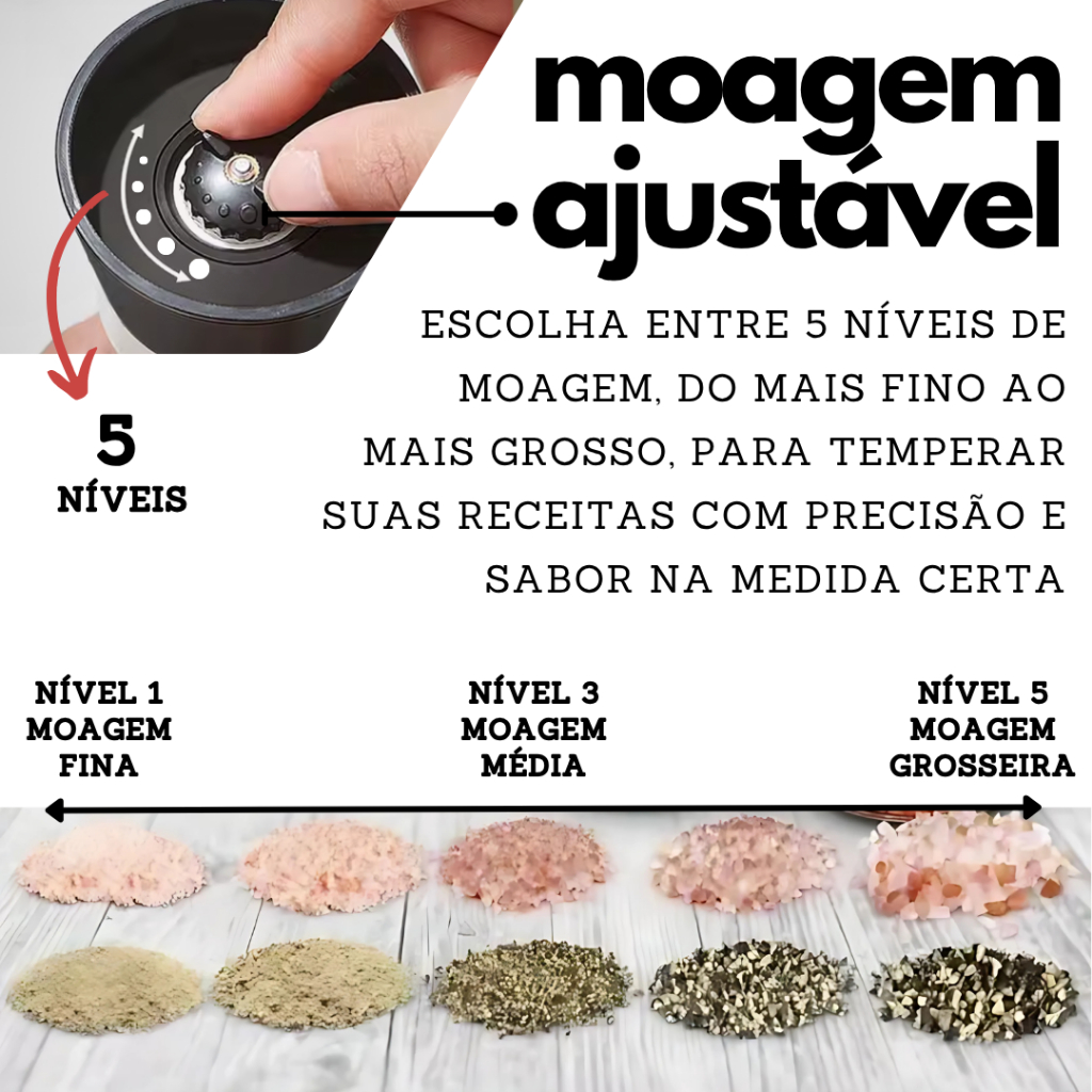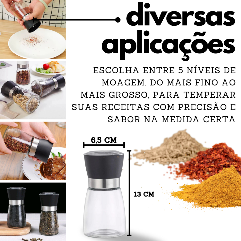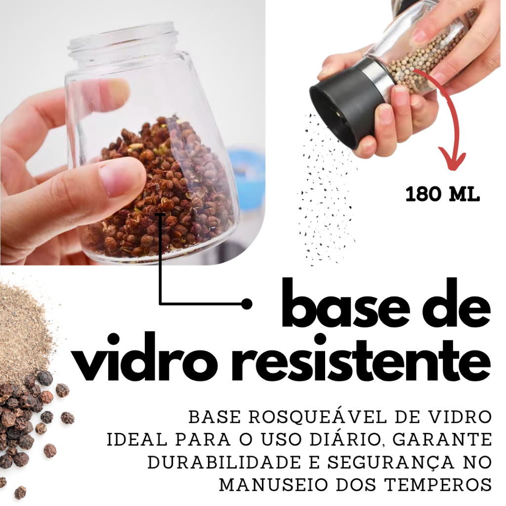 Moedor de Sal Grosso e Pimenta do Reino Vidro e Aço Inox Com Regulagem Fino Grosso