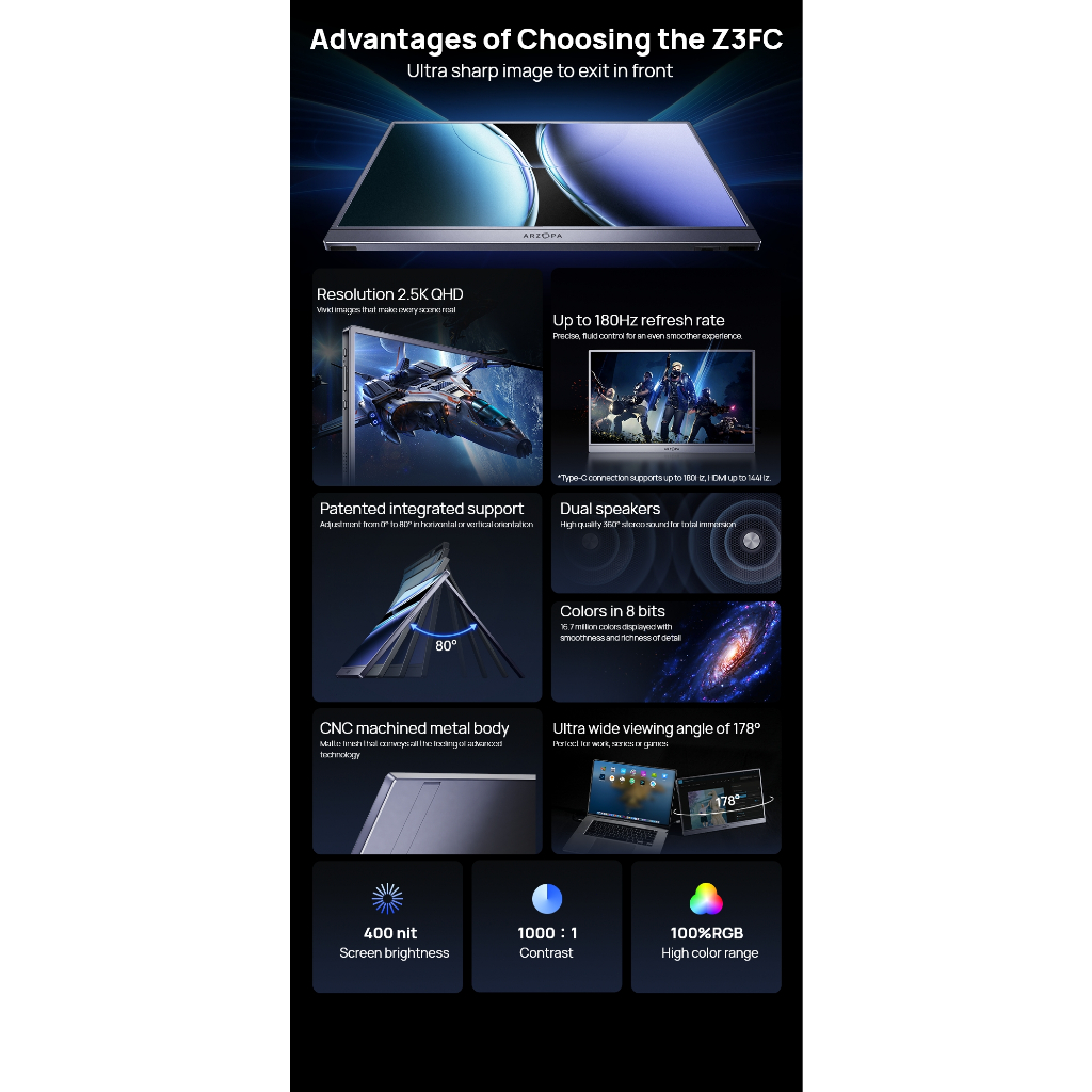 Monitor Portátil ARZOPA 16.1'180 Hz-Cinza Z3FC , Com Suporte 107 % sRGB 2.5K HDR , Ultrafino , Cuidados Os Olhos , Segun