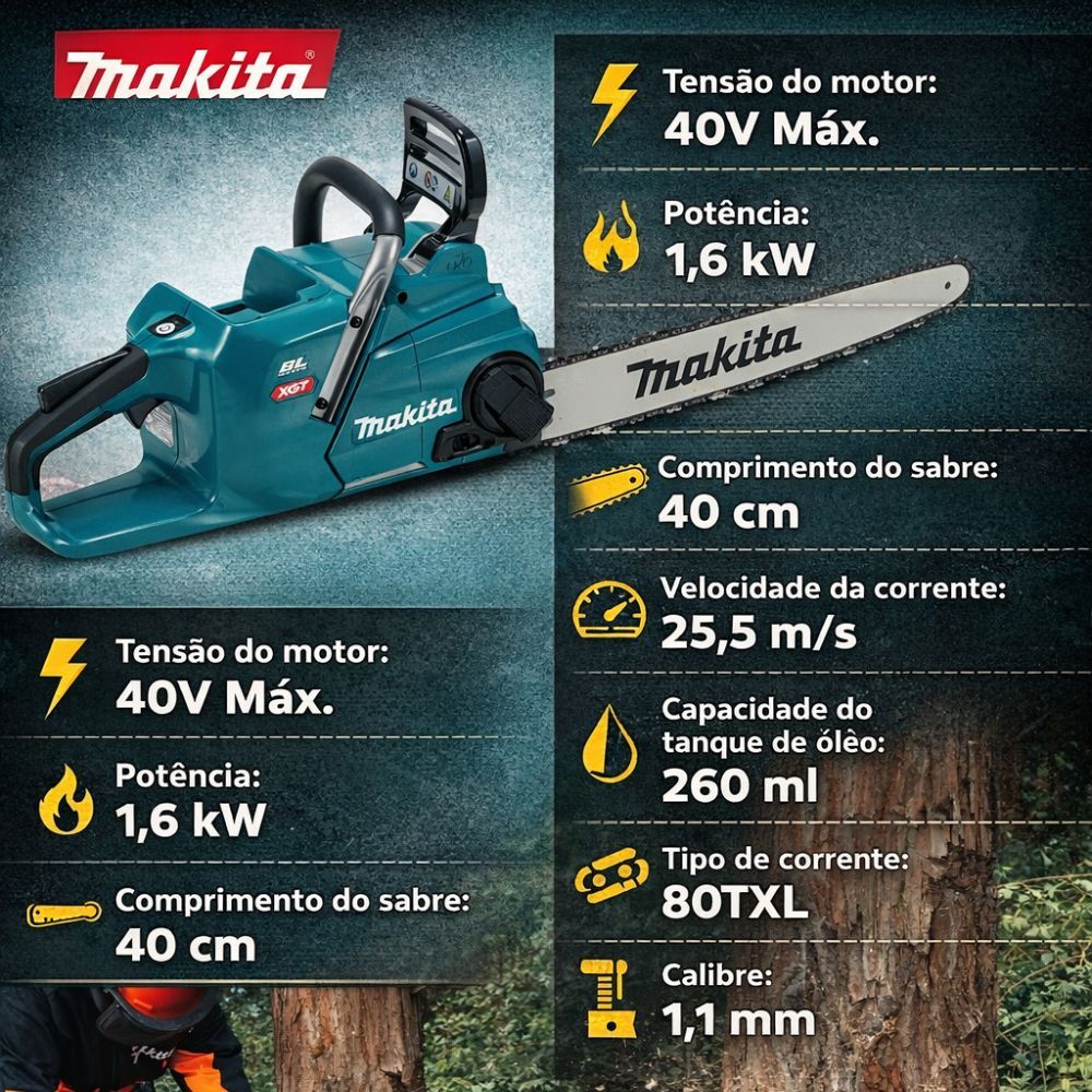 Motosserra a Bateria Makita UC016GZ 40V Profissional com Bateria 5.0Ah Carregador Bivolt e Bolsa