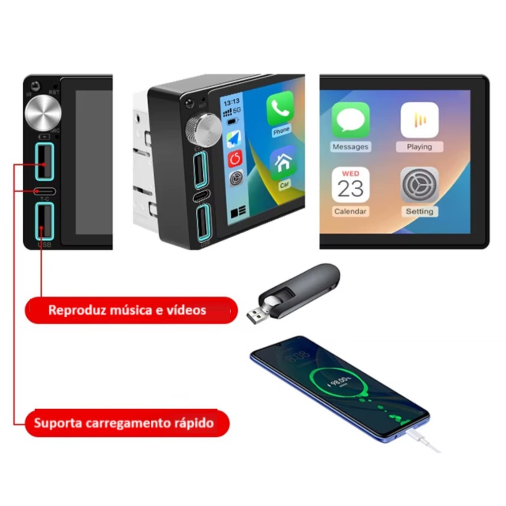 Multimídia 1Din Tela 6.9 Full Com Android Auto, CarPlay, Botão de volume, USB-C, Espelhamento C/ Fio