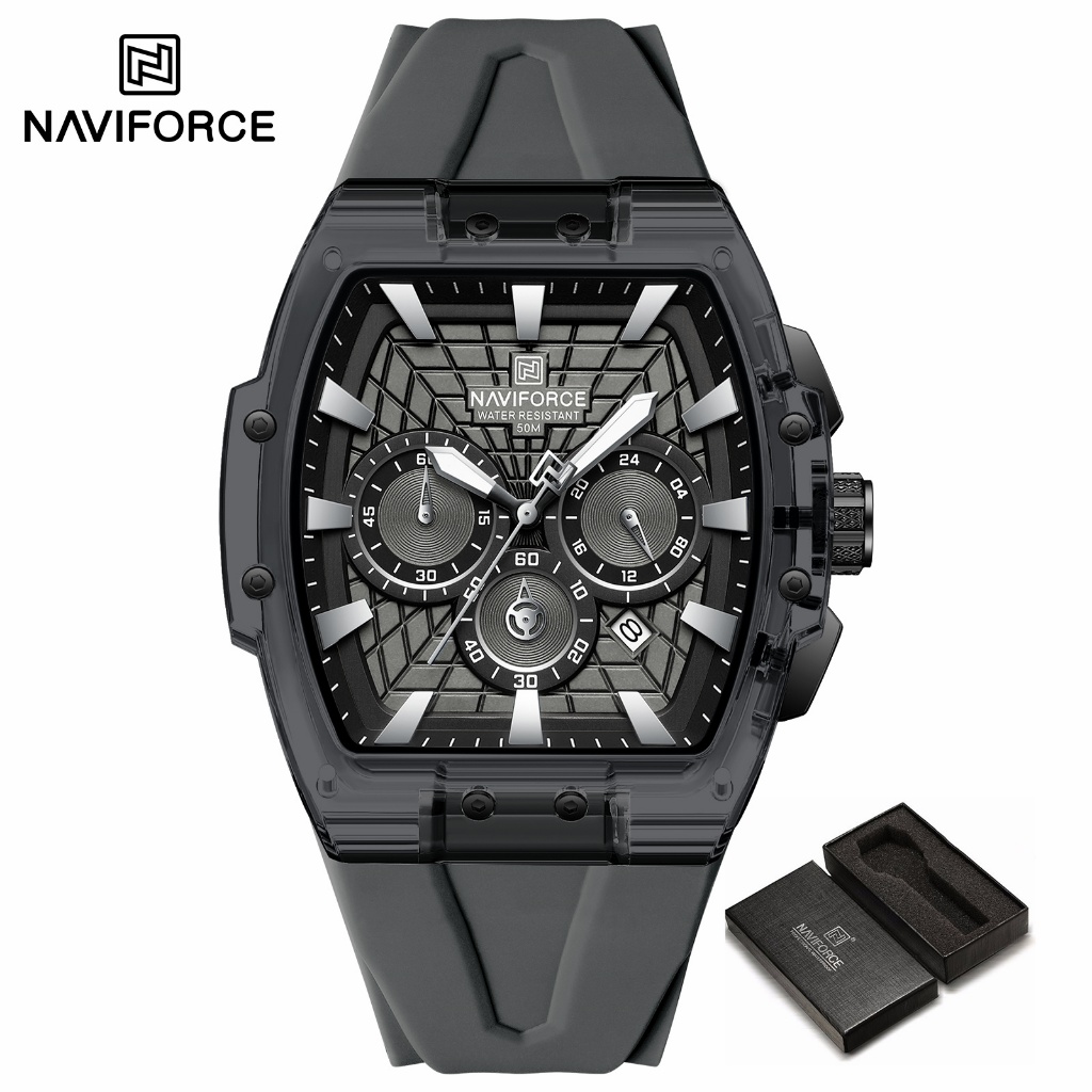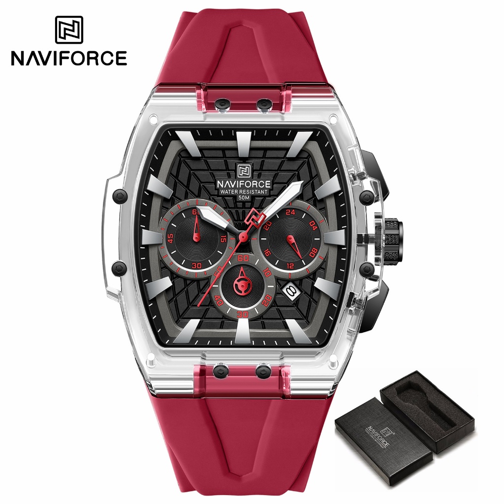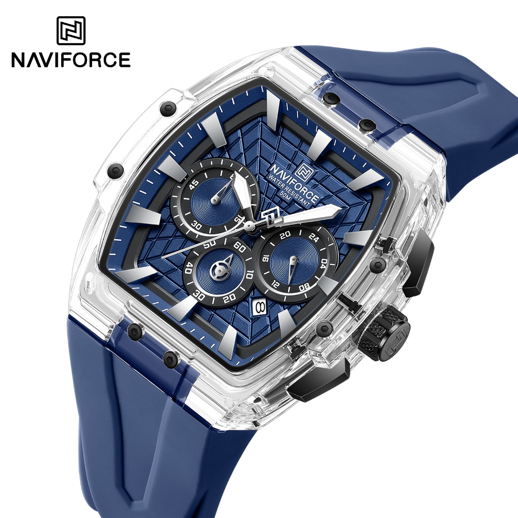 NAVIFORCE 6113 Novo Design Transparente Tonneau Masculino Quartzo Relógio Esportivo Impermeável