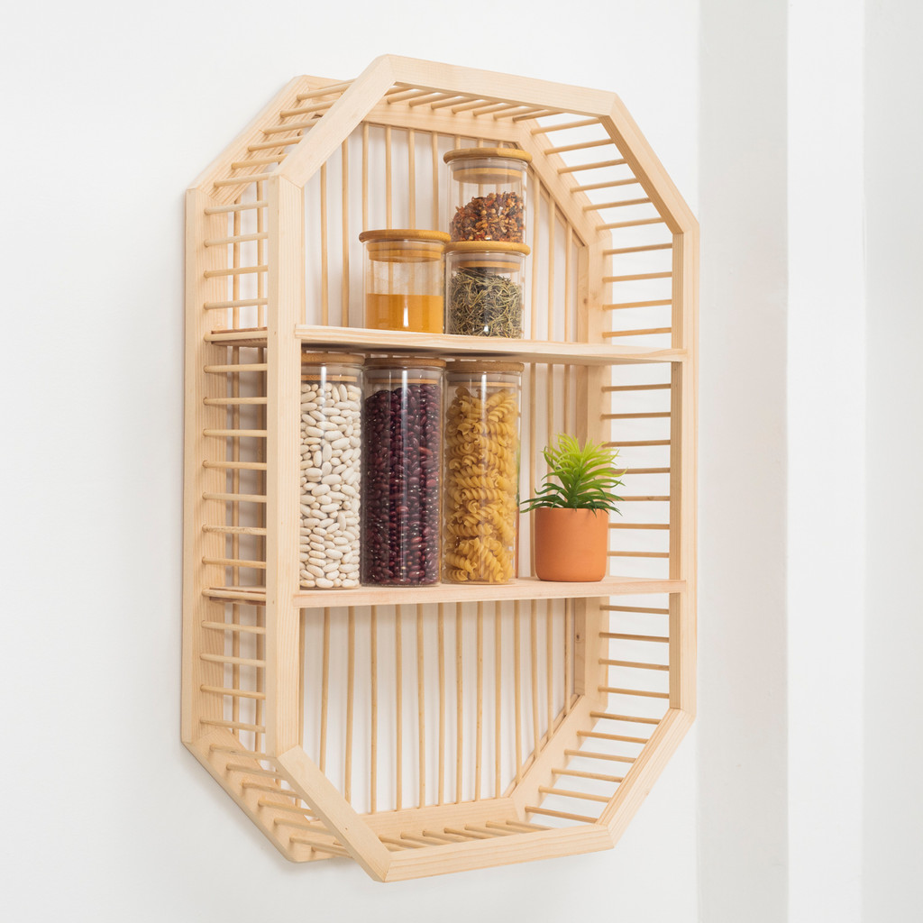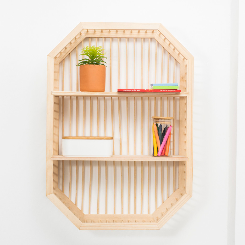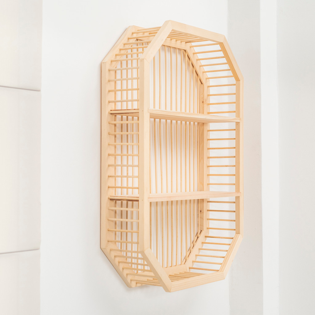 Nicho ripado de madeira com prateleiras - Oikos