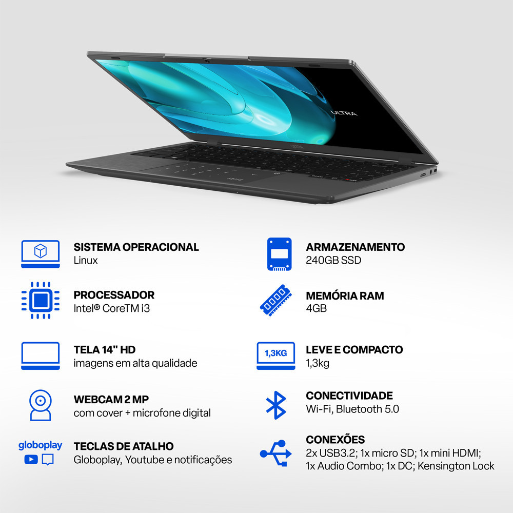 Notebook Ultra Linux Tela 14 Pol HD Intel Core i3 4GB RAM 240GB SSD Cinza Escovado - UB481