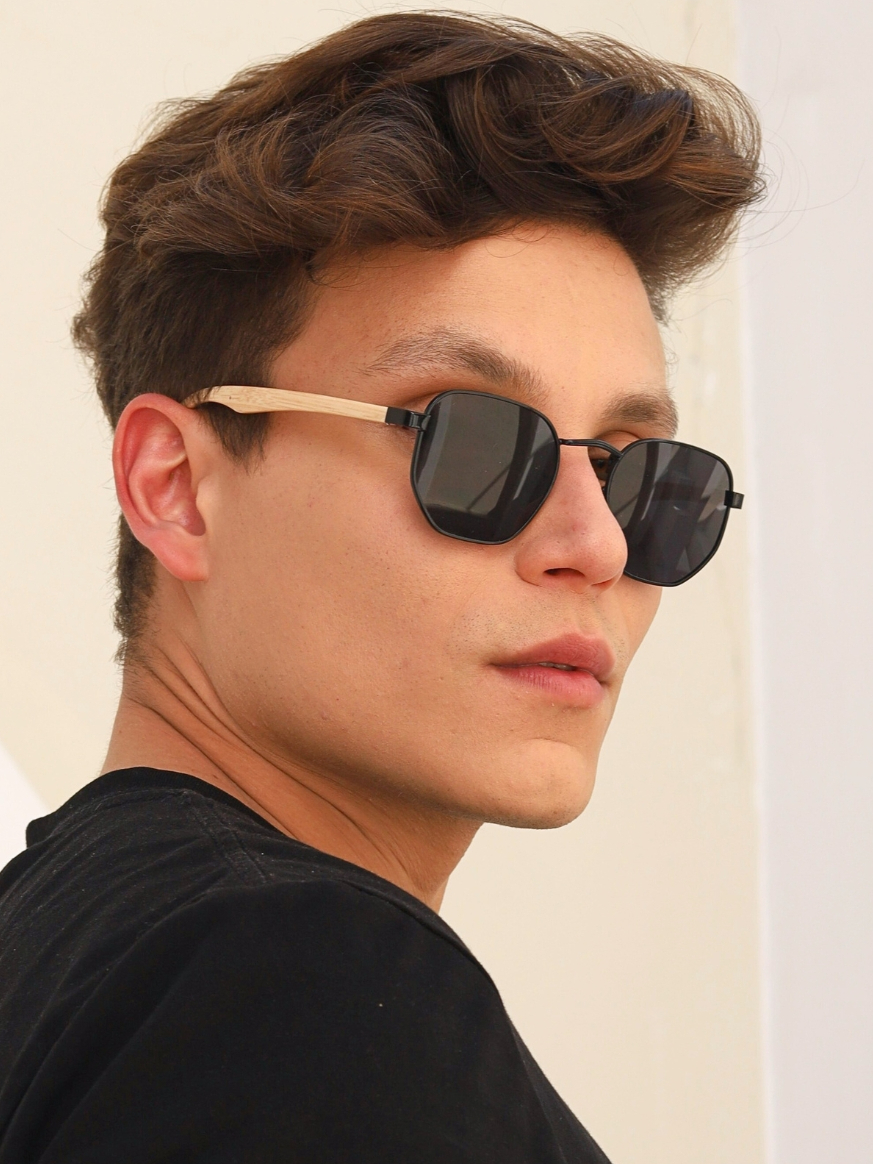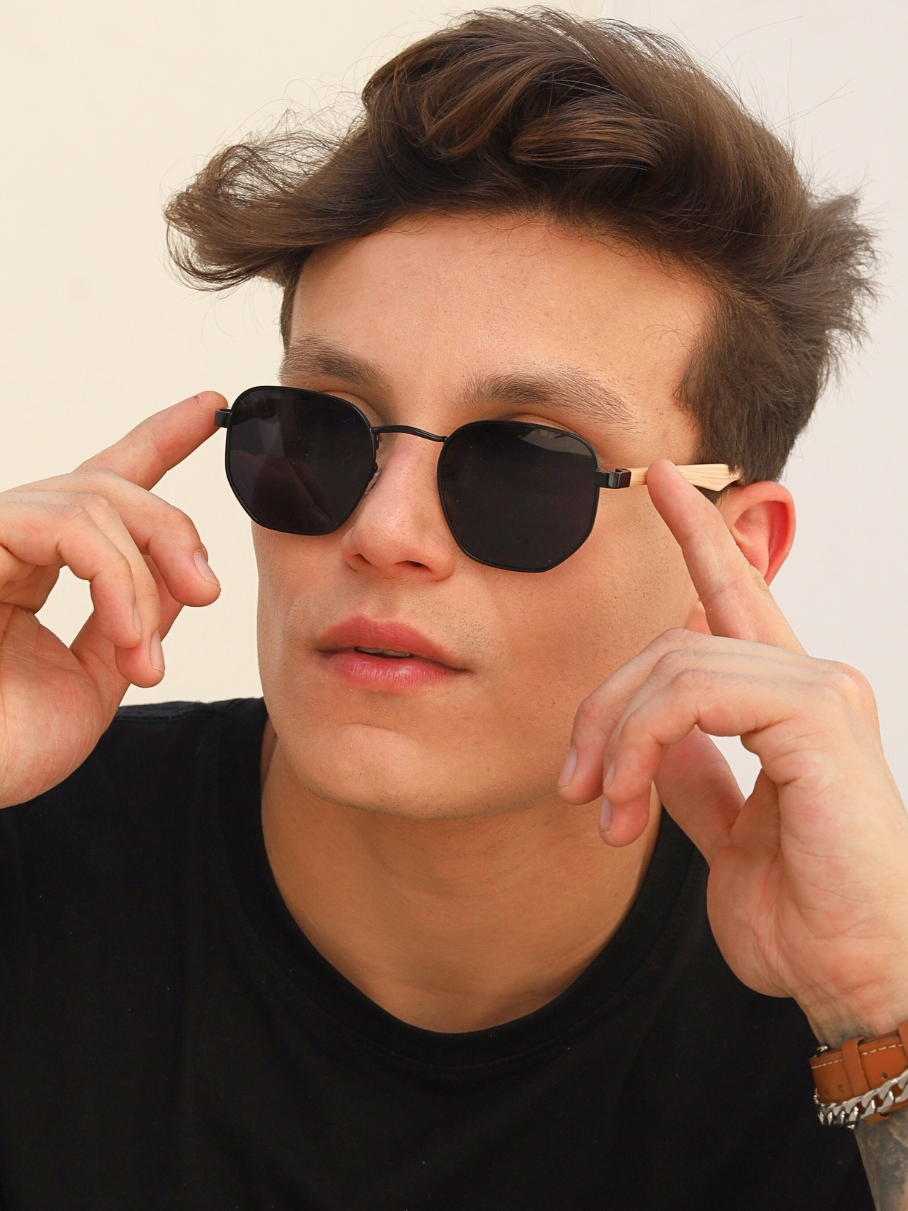 Oculos de Sol Hexagonal Preto e Madeira Premium Mais Vendido Classico uv400 Masculino Feminino