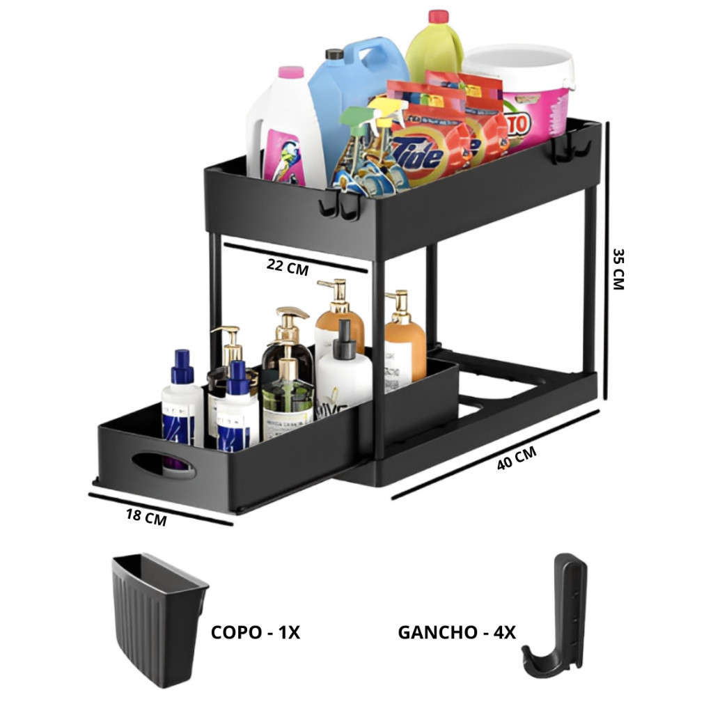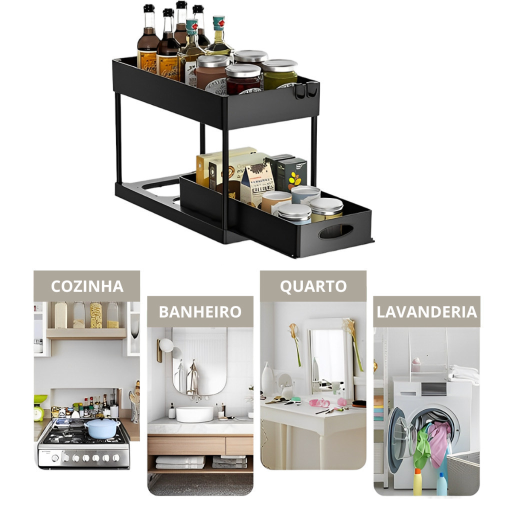 Organizador Multiuso Com Bandeja Deslizante 2 Andares C/ Ganchos Banheiro Cozinha Pia Deslizante