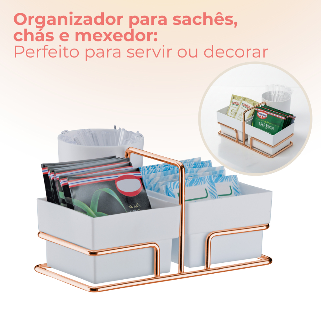 Organizador Para Saches De Açúcar Adoçante Mexedor Chá Café De Bancada Rose Gold
