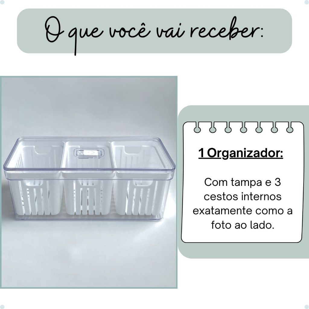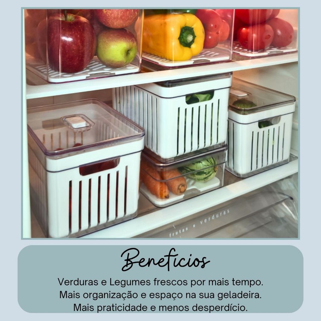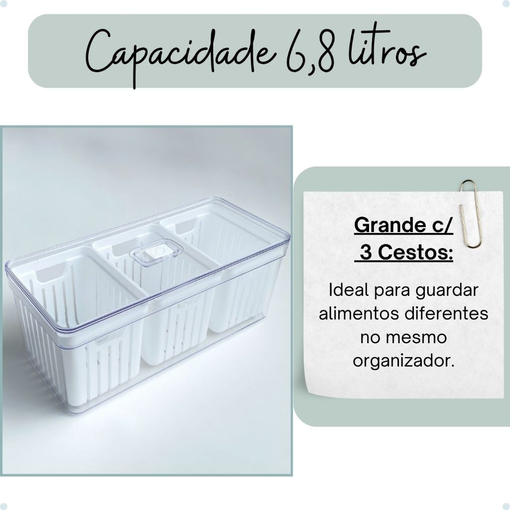 Organizador de Geladeira Grande com 3 Cestos de Drenagem e Tampa com Controle de Ventilação - 6,8 LITROS.
