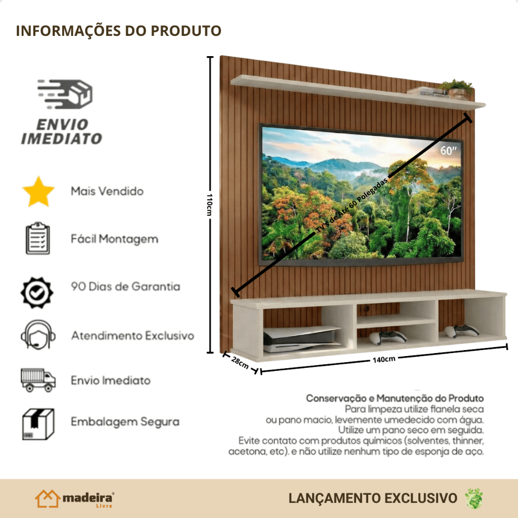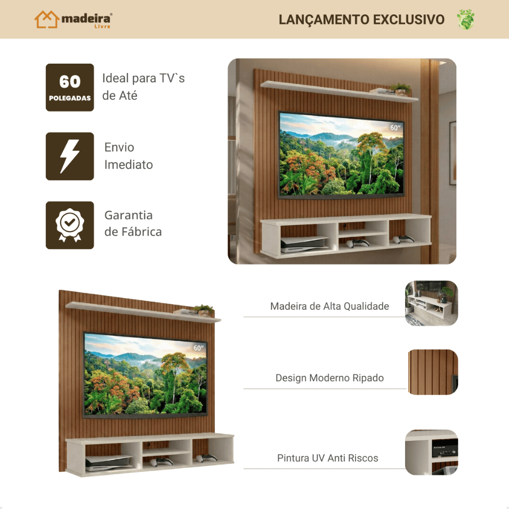 Painel Ripado Para TV até 60 Polegadas com Nicho Espaçoso e Prateleira Ideal para Sala Estante