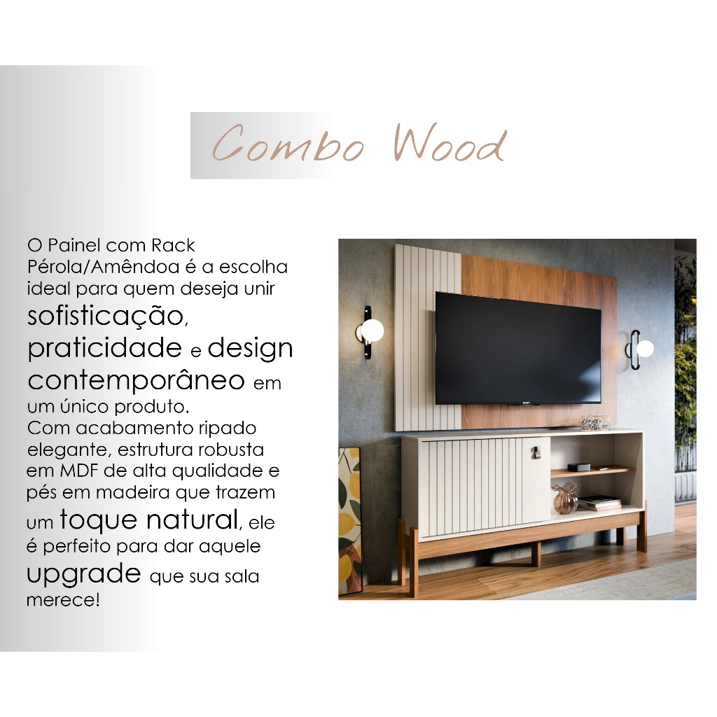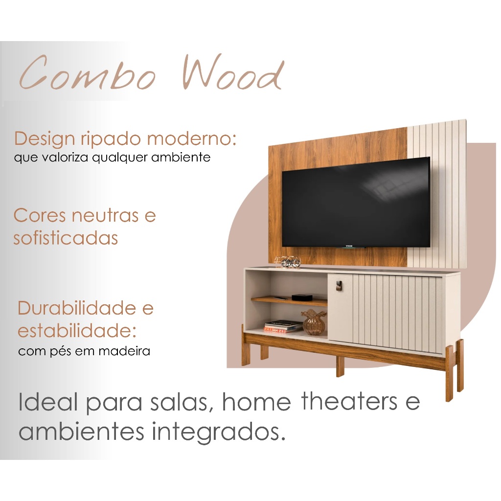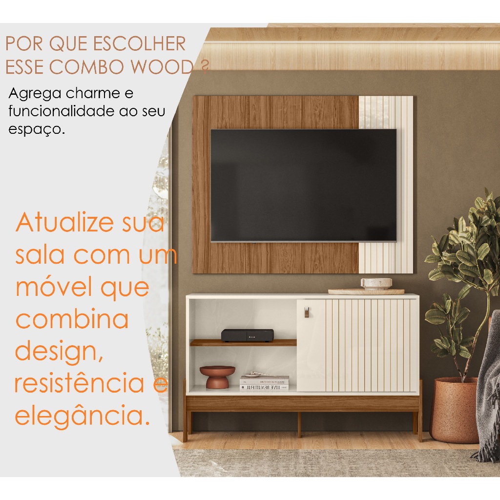 Painel com Bancada para TV até 42” – Design Moderno Decorativo em Madeira e Branco com Ripado