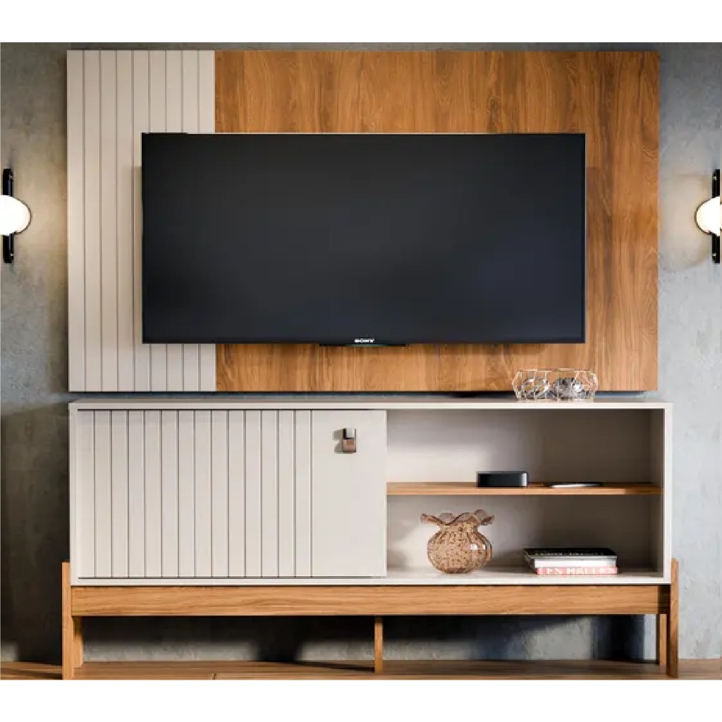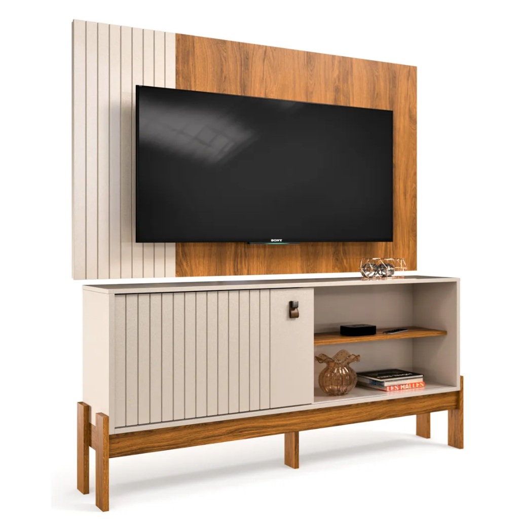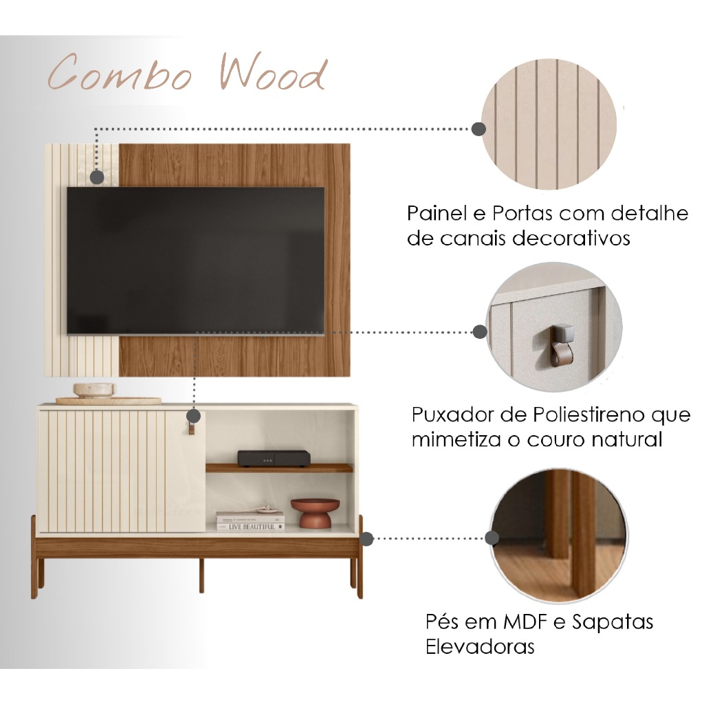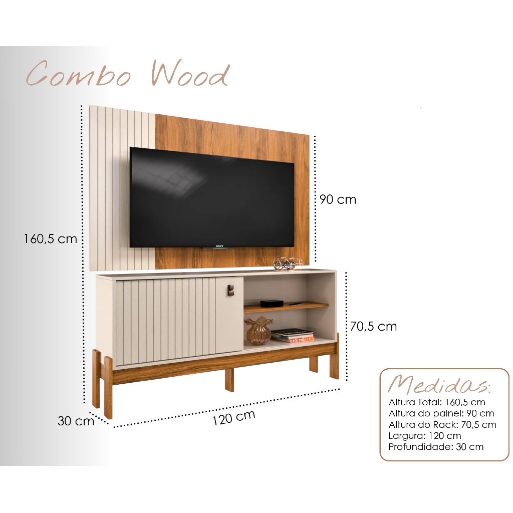 Painel com Bancada para TV até 42” – Design Moderno Decorativo em Madeira e Branco com Ripado