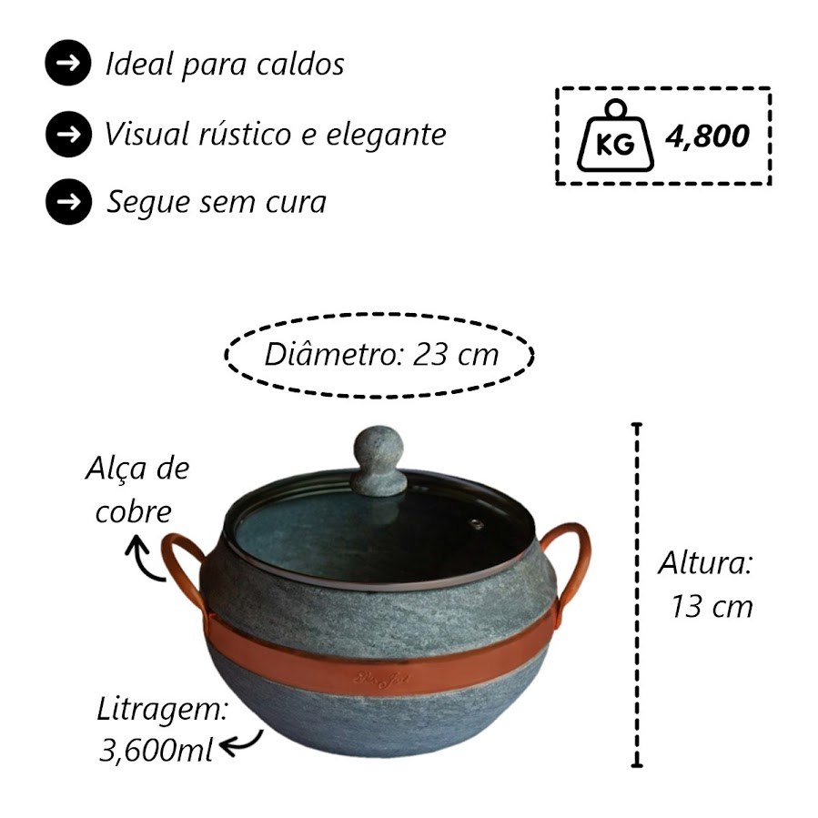 Panela Bojuda Caldeirão em Pedra Sabão Tampa Vidro 3,6 Ltrs