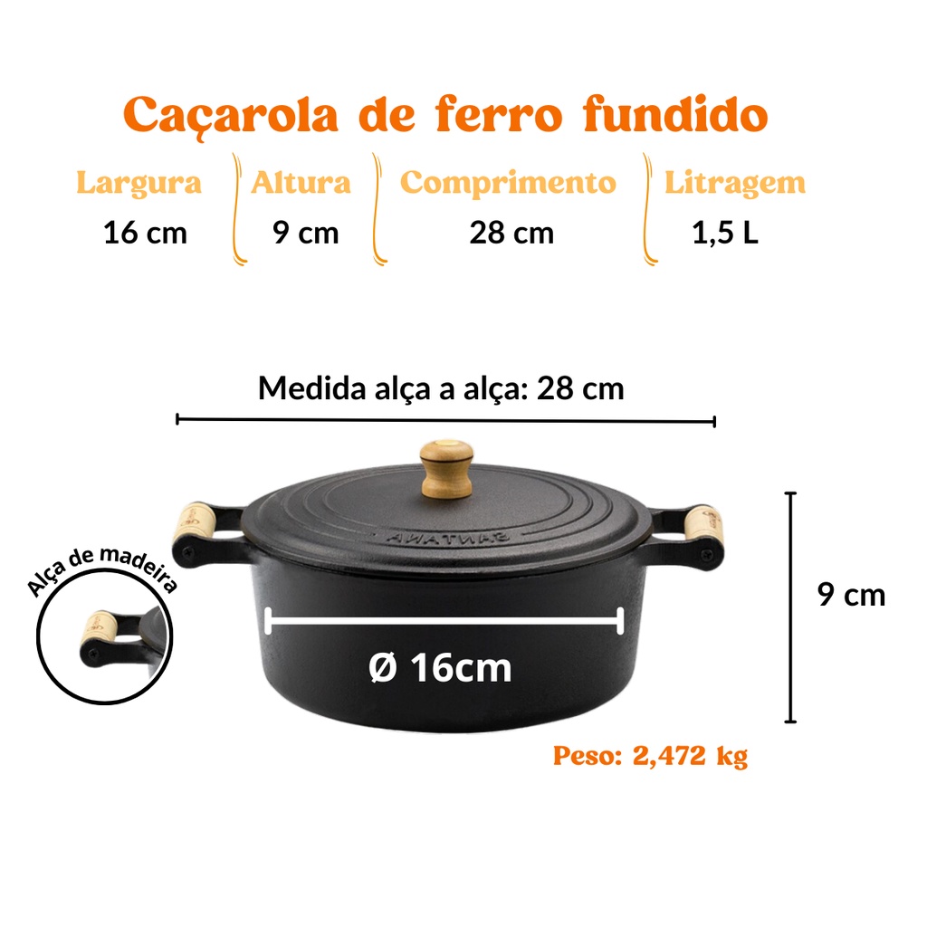 Panela De Ferro Caçarola de Ferro Fundido com Tampa de Ferro 1,5 L 16 cm Santana