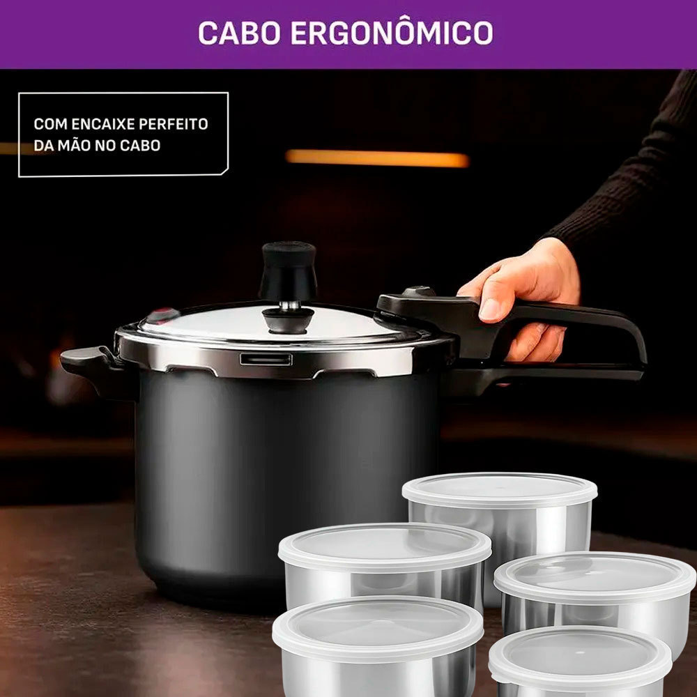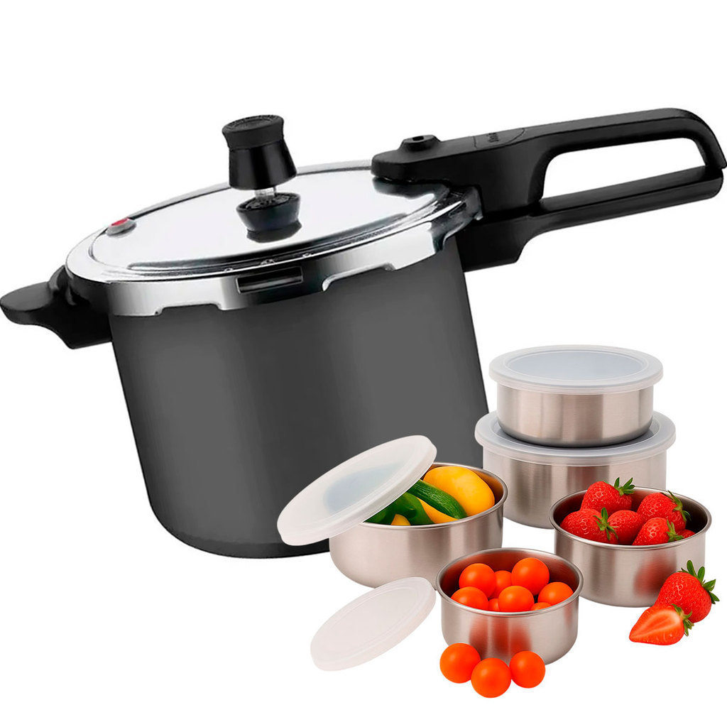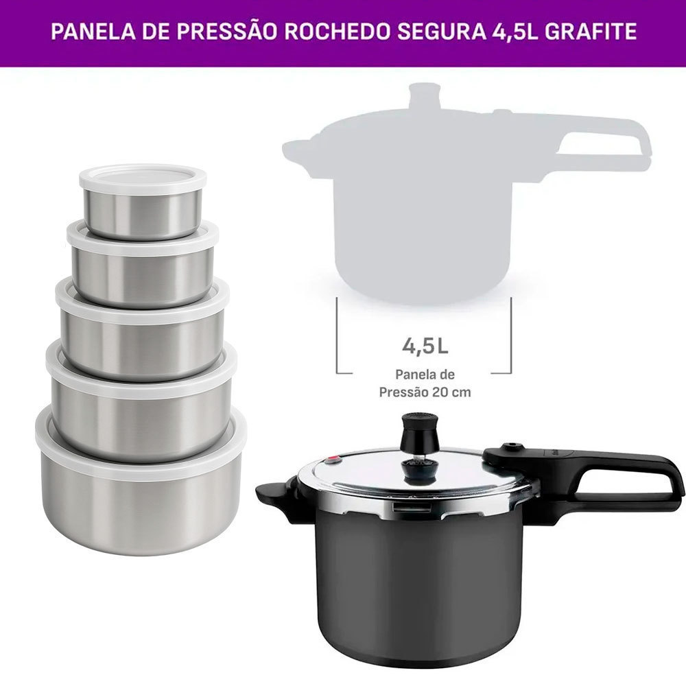 Panela De Pressão 4,5L Rochedo Segura Grafite Antiaderente Com Jogo De Potes 5pçs Em Aço Inox