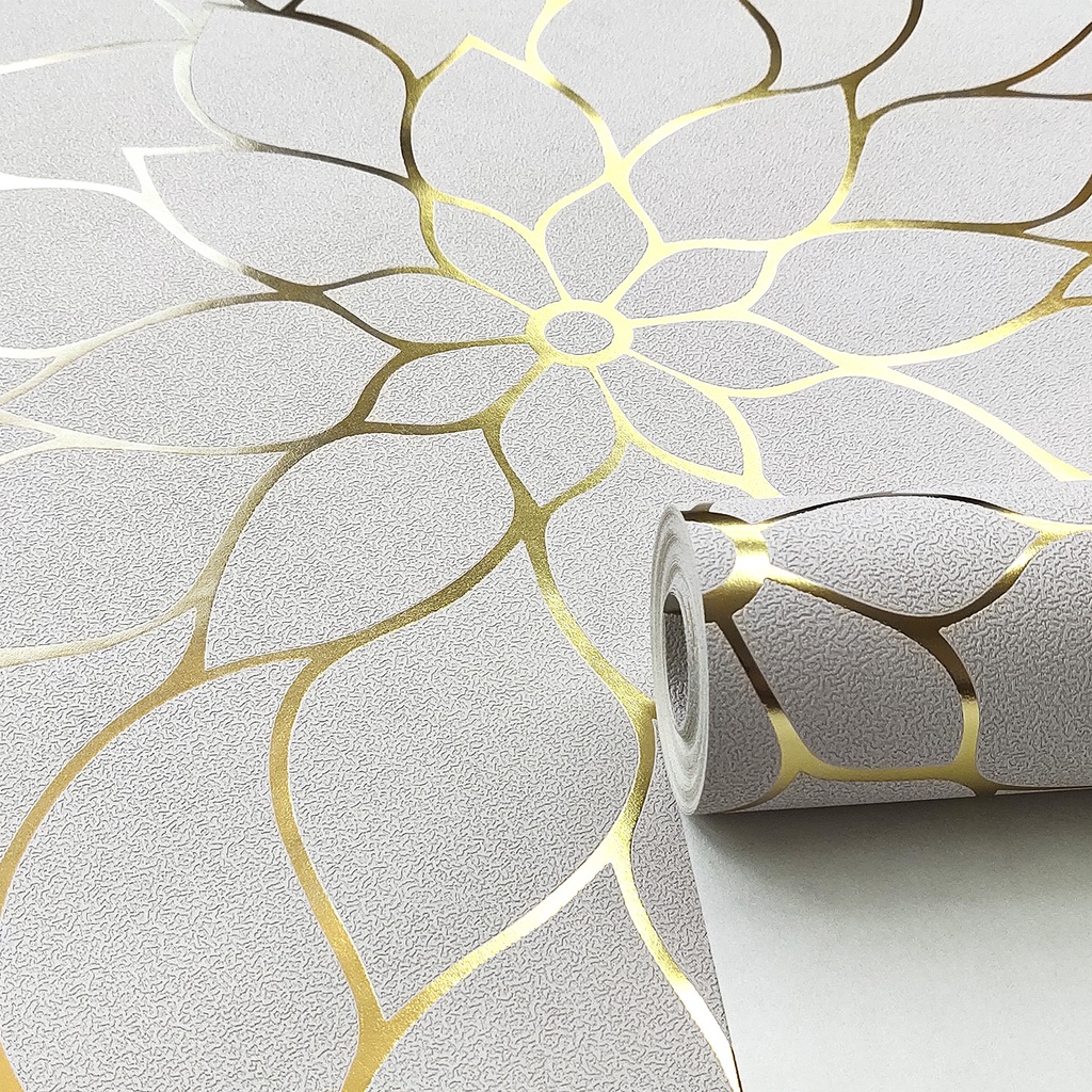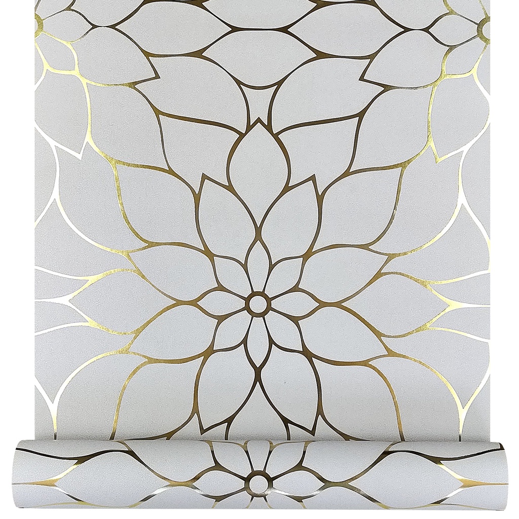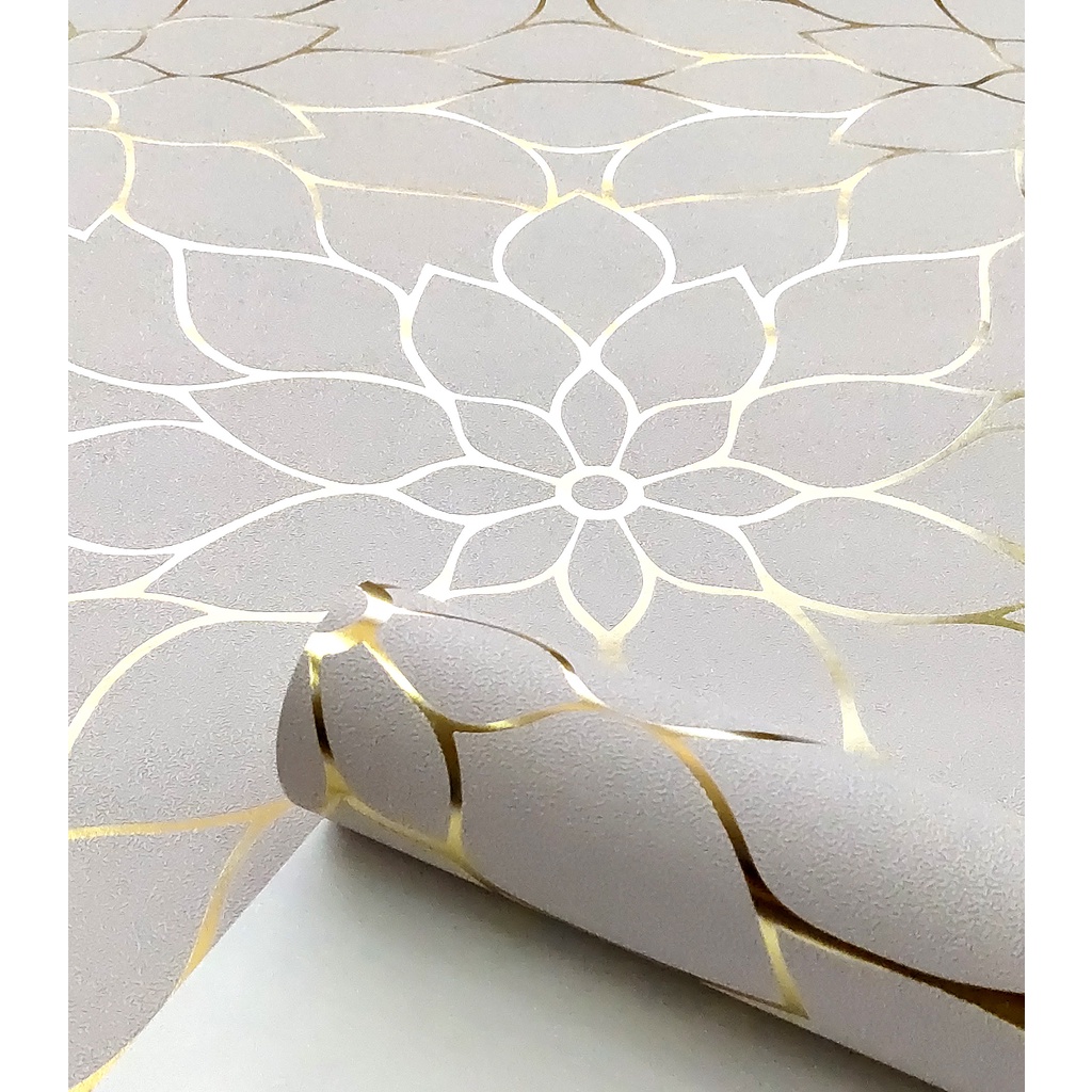 Papel De Parede Vinílico Importado Alto Relevo - Rolo 10m x 53cm + Cola Grátis - Modelo 114 - Fundo Nude com Flores Douradas (Metalizado)