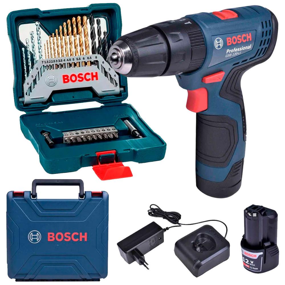 Parafusadeira Furadeira 12V Impacto GSB 120-LI 2 Baterias Bivolt + Kit X-line 30 Peças BOSCH